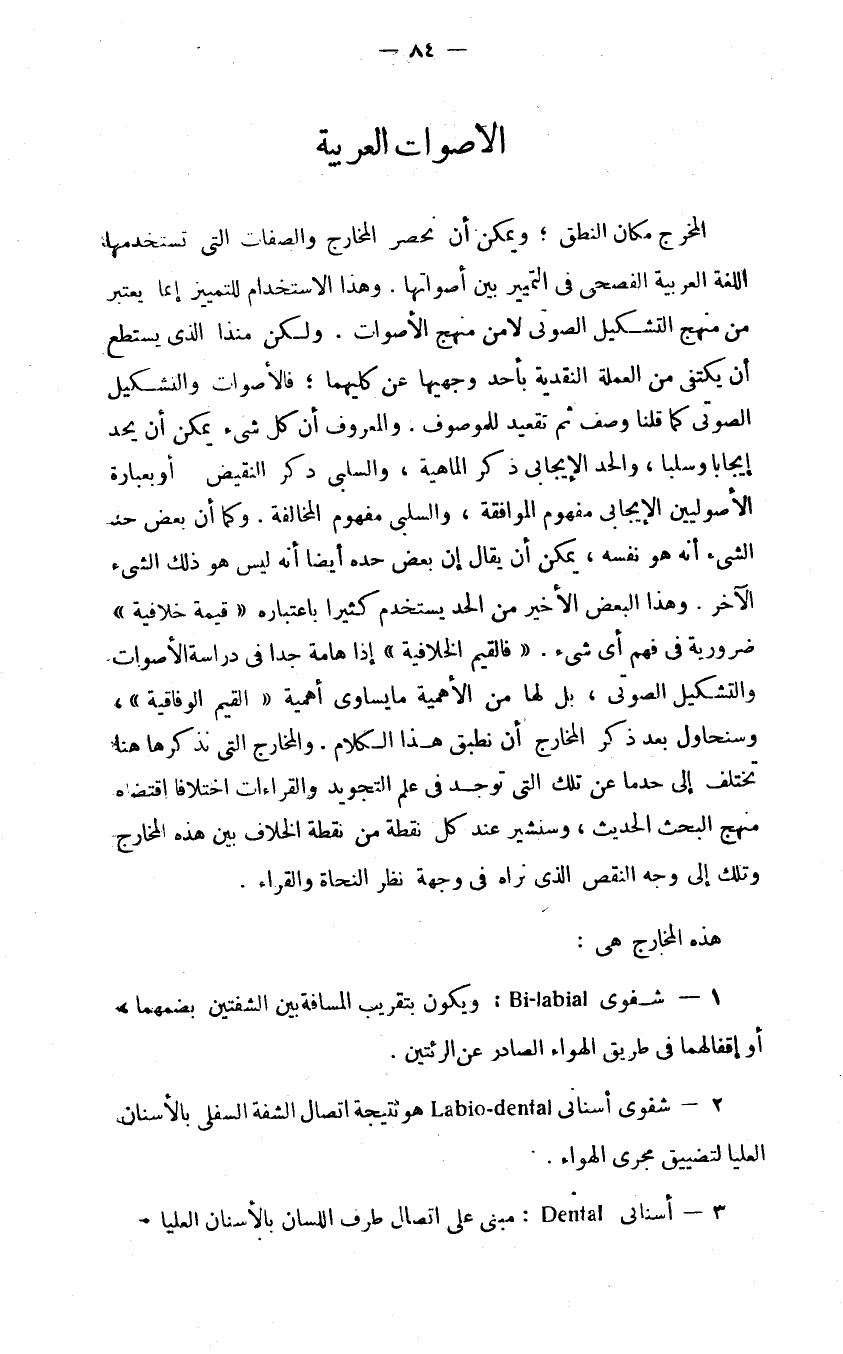 والتفريق بين معانيها، وتلك أشياء تأتيب بعد دراسة الأصوات من حيث هي، ولكنها تستقل عن دراسة الأصوات استقلالا تاما، فالمقابلة بين مجهور ومهموس ثم مفخم ومرقق، ثم صحيح وعلة، ثم شديد ورخو ومركب ومتوسط، ثم بين طويل وقصير، وبين مخرج ومخرج آخر، وبين النبر وعدمه، وبين اللحن الأول واللحن الثاني، كل أولئك وما يتصل به من فهم دلالة كل مقابل من هذه المقابلات، هو الأساس الذي ينبني عليه علم التشكيل الصوتي.