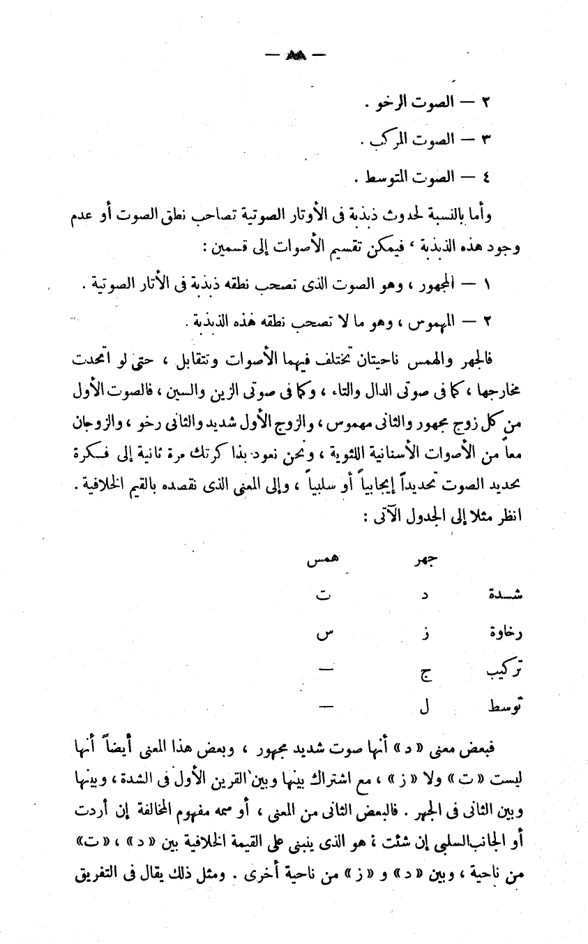 الصحاح Consonants "حروف صحيحة" Non- Vocoids أصوات صحيحة العلل: Vowels "حروف علة" Vocoids "أصوات علة". ويقول2: "إن صوت العلة هو الصوت الذي يخرج الهواء أثناء نطقه: 1- من الفم 2- على وسط اللسان "أي أنه ليس جانبيا" 3- بلا احتكاك في الفم "ولكن الاحتكاك في مكان آخر، لا يمنع الصوت من أن يكون صوت علة، والآن نحاول تأمل الأصوات الصحيحة: وتشمل هذه أي صوت يخرج الهواء