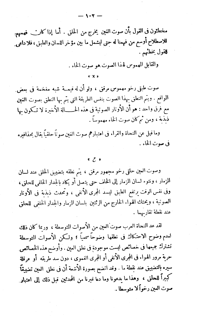 في العربية ستة مقاطع، في كل منها صحيح واحد أو أكثر، وعلة واحدة فحسب، سواء أكانت هذه طويلة أم قصيرة، فإذا رمزنا للصحيح بالرمز "ص" وللعلة بالرمز "ع"، إذا كان قصيرًا و"ع ع" إذا كان طويلًا، أمكننا أن نبني المقاطع العربية في أشكاله المختلفة.