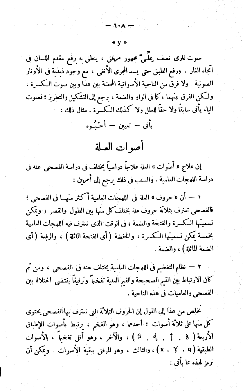 الكسرة والفتحة والضمة، مع موقعية القصر "أي أن هذه الثلاثة تأتي قصيرة في شكل حركات في هذه المقاطع"، أما المقطعان ص ع ع، ص ع ع ص، فلهما هذه الإمكانيات مع موقعية الطول، "أي أن هذين المقطعين يشتملان على الكسرة، أو الفتحة، أو الضمة في صورة ياء المد، أو ألفه على التعاقب"، وهذا في الفصحى؛ أما في اللهجات العامية، فإن "ص ع ع ص" يضم إلى ذلك اشتماله على الخفضة، والرفعة أيضا، وهما لا تأتيان مطلقا في ص ع ع، لقد قمت بدراسة تجاور حروف العلة، بتجاور المقطاع التي ترد فيها في لهجة عدن، في رسالتي للدكتوراه، وهي دراسة إحصائية طويلة، نمسك عن إيرادها هنا لاعتبار المسافة المخصصة في الكتاب.