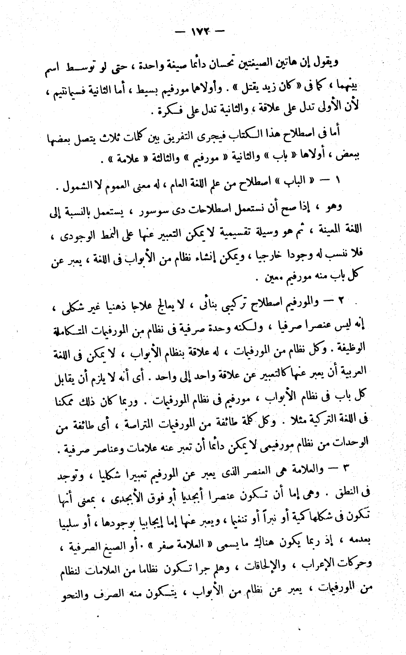 1- الحالة: هنا أيضا يجب أن نلاحظ أن العلاقة التي نسميها الحالة، ليست إلا علاقة شكلية بين الأبواب، أو بين الكلمتين من باب واحد، وهي مع ذلك جزء آخر من أجزاء التطريز النحوي، وللحالة مجال في الأسماء، والأفعال، والأدوات؛ أي أنها تجد تعبيرها الشكلي في أولئك جميعا، ولكنها ينظر إليها في الغالب باعتبارها في الأسماء، ولهذا نرى دراسة الحالات المختلفة في الإغريقية واللاتينية، تأتي في كتب الجرامطيقا تصريفات للأسماء لا للأفعال، ويبدو بصفة عامة أن هذا يلقى شيئا من الغموض على حقيقة هامة، هي أن الحالة ليست إلا وسيلة آخرى من وسائل النمطية النحوية.