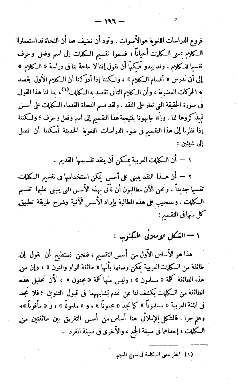 أن يتوقع مني التعريف التقليدي: "الكلمة لفظ مفرد"؛ لأني قد نقدته، ولا أدري أن كانت قد نقضته أيضا، ولست أريد أن يتوقع التقسيم التقليدي: "الكملة اسم، وفعل، وحرف"، ليحل محل التعريف المنقود؛ لأن هذا التقسيم لا يحل المشكلة من الناحية المعجمية من جهة، وقاصر عن أن يشمل جميع أقسام الكلام العربي، كما رأينا منذ قليل، فالتعريف الذي أريد أن أسوقه إذا تعريف يتصل بوظيفة الكلمة، أكثر مما يتصل بتقسيمها، وسوف لا أبني هذا التعريف على الشكل الإملائي العربي؛ لأن الإملاء العربي نظام لغوي قائم بذاته كالنحو، والصرف، والمعجم؛ ولأن العرف قد وضعه بشكله المعين، دون رجوع شامل إلى مقتضيات الدراسات اللغوية التي ترتبط به؛ حتى إنك لتجد جملة بأكملها متصلة في الكتابة، نحو: "سنستقبلهم"، وتجد كلمة واحة يستقل كل رمز منها عن الآخر، نحو "داود"، و"وزارة".