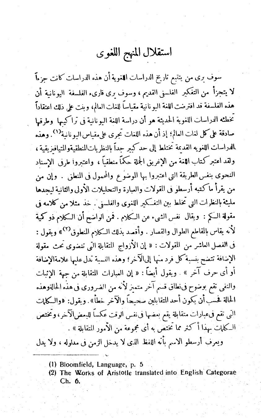 وبما كتبه أرسطو، فخلط فيه بين الدراسات اللغوية والدراسات الفلسفية. وأوضح مثال لذلك هو العلل والأقيسة في النحو. "ومما يجب أن يسقط من النحو العلل الثواني والثوالث، وذلك مثل سؤال السائل عن "زيد" من قولنا: "قام زيد" لم رفع؟ فيقال: لأنه فاعل، وكل فاعل مرفوع، فيقول: ولم رفع الفاعل؟ فالصواب أن يقال له: كذا نطقت به العرب. ثبت ذلك بالاستقراء من الكلام المتواتر.