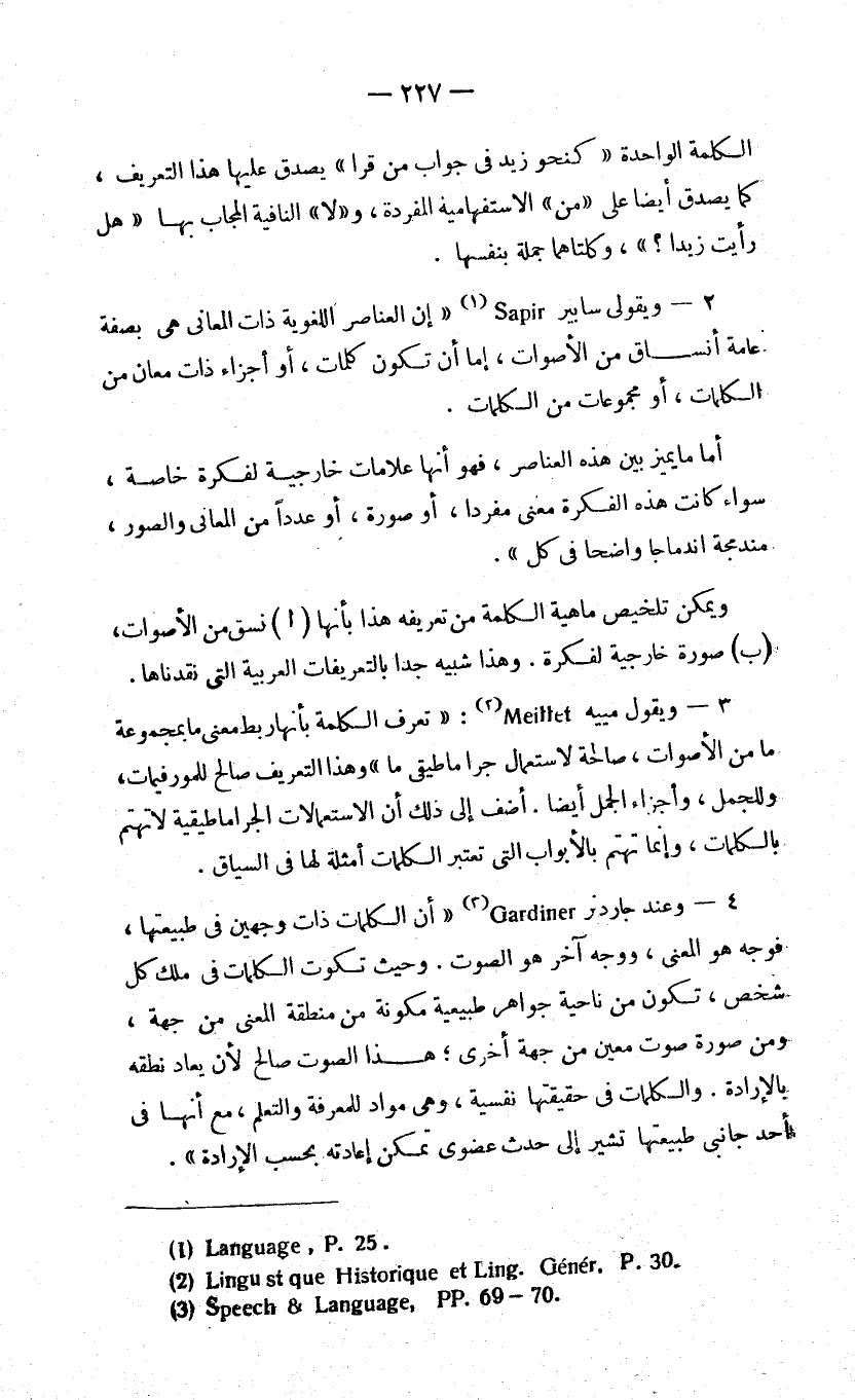ولسنا نلقى اللوم في هذا على علماء النفس والاجتماع، ما دام من السهل أن يحصل اللغوي على تمرين كاف في علمي النفس والاجتماع، يمكنه من السير بمفرده في هذا السبيل؛ ولنسا بهذا نهدف إلى علم اللغة الاجتماعي، بل نبني على قواعد من علم اللغة، فبلا وجود الأصوات، لا يمكن وجود صرف لأي لغة من لغات الكلام، وبلا وجود التنغيم، لا يمكن أن يوجد النحو وجودًا كاملا.