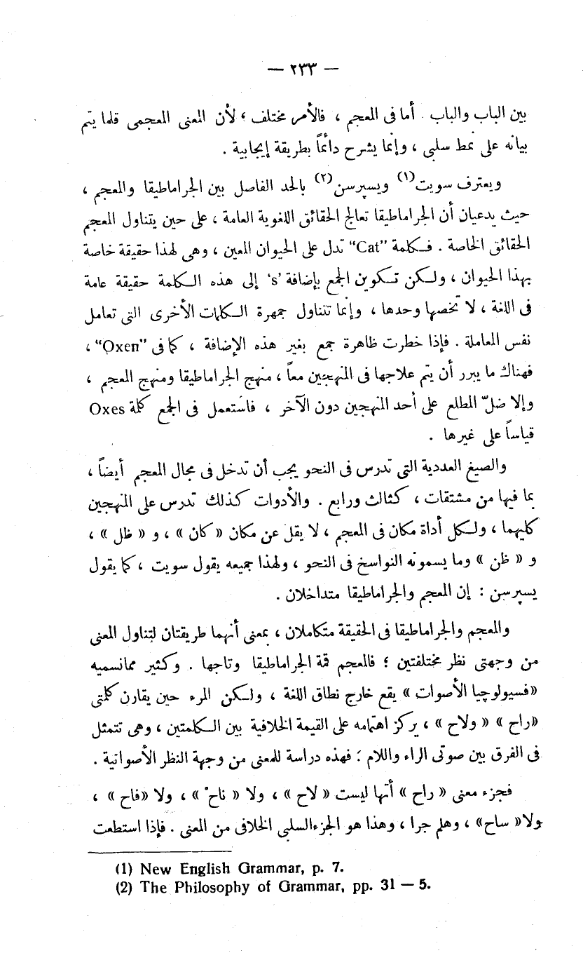 الحقائق اللغوية، وكل ما جرى منها وظيفة الماجري الذي يشتمل عليه، ولا يزال يشتمل كل من هذه الماجريات على الآخر، حتى تحتويها جميعا ماجريات الثقافة التنشيئية، فالمعنى في رأي فيرث كل مركب من وظائف لغوية هي وظائف الصيغة، والعناصر الهامة في هذا الكل المركب هي الوظيفة الأصواتية "الصغرى"، ثم الوظائف الكبرى المعجمية، والصرفية والنحوية، ووظيفة الماجريات الدلالية بصفة عامة، وإليك طريقة من طرق تحليل هذه العناصر: