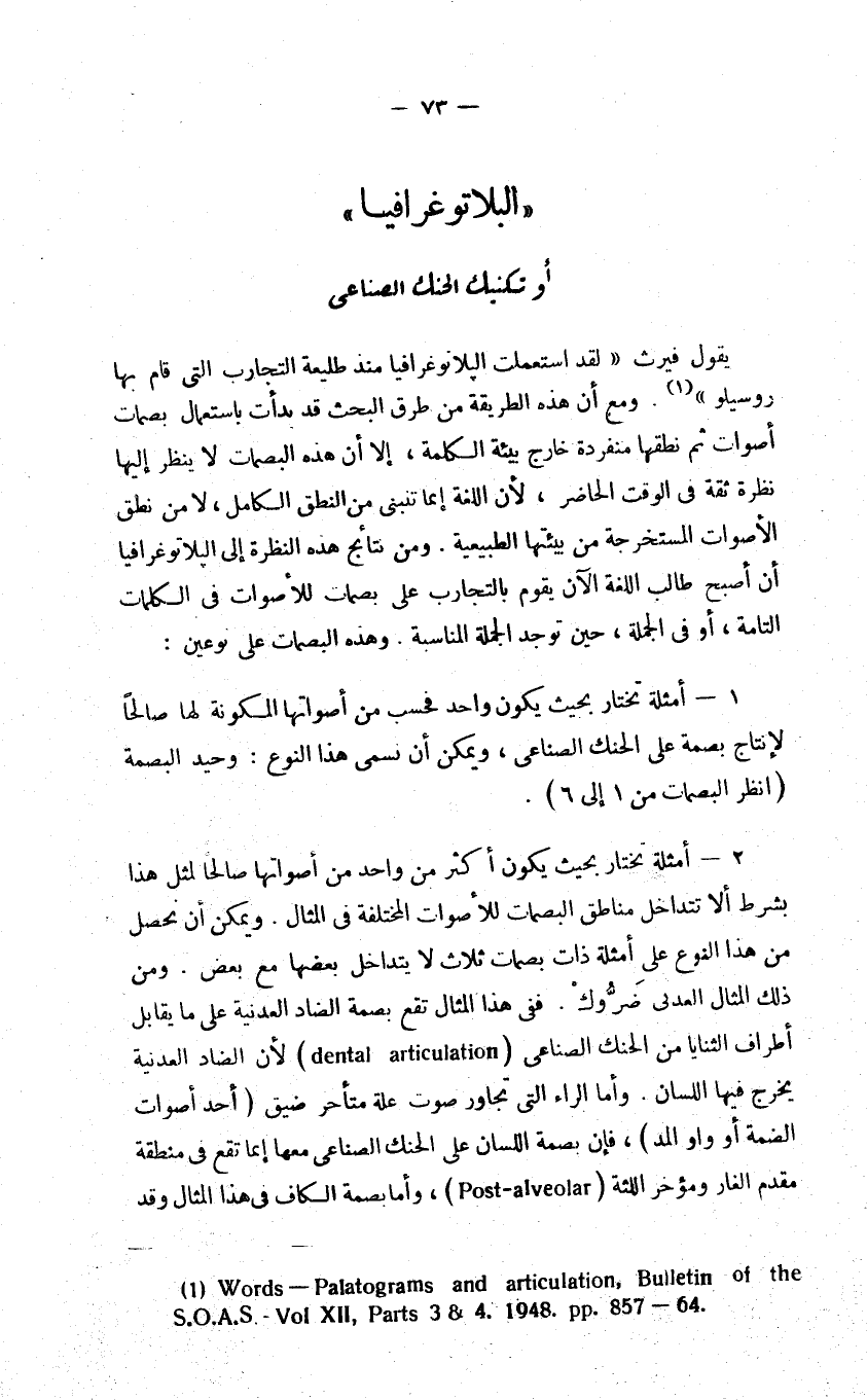 هذه الصورة على أي حال -مهما كانت ضوءًا يلقى على الحركات النطقية- تعتبر ضوءا من خارج تكتيك الدراسات اللغوية، وهي تقبل في هذه الدراسات دائما على شرط فهمها كذلك، وعلى شرط ألا تتعارض مع تكنيك لغوي آخر، كالملاحظة، أو البلاتوغرافيا.