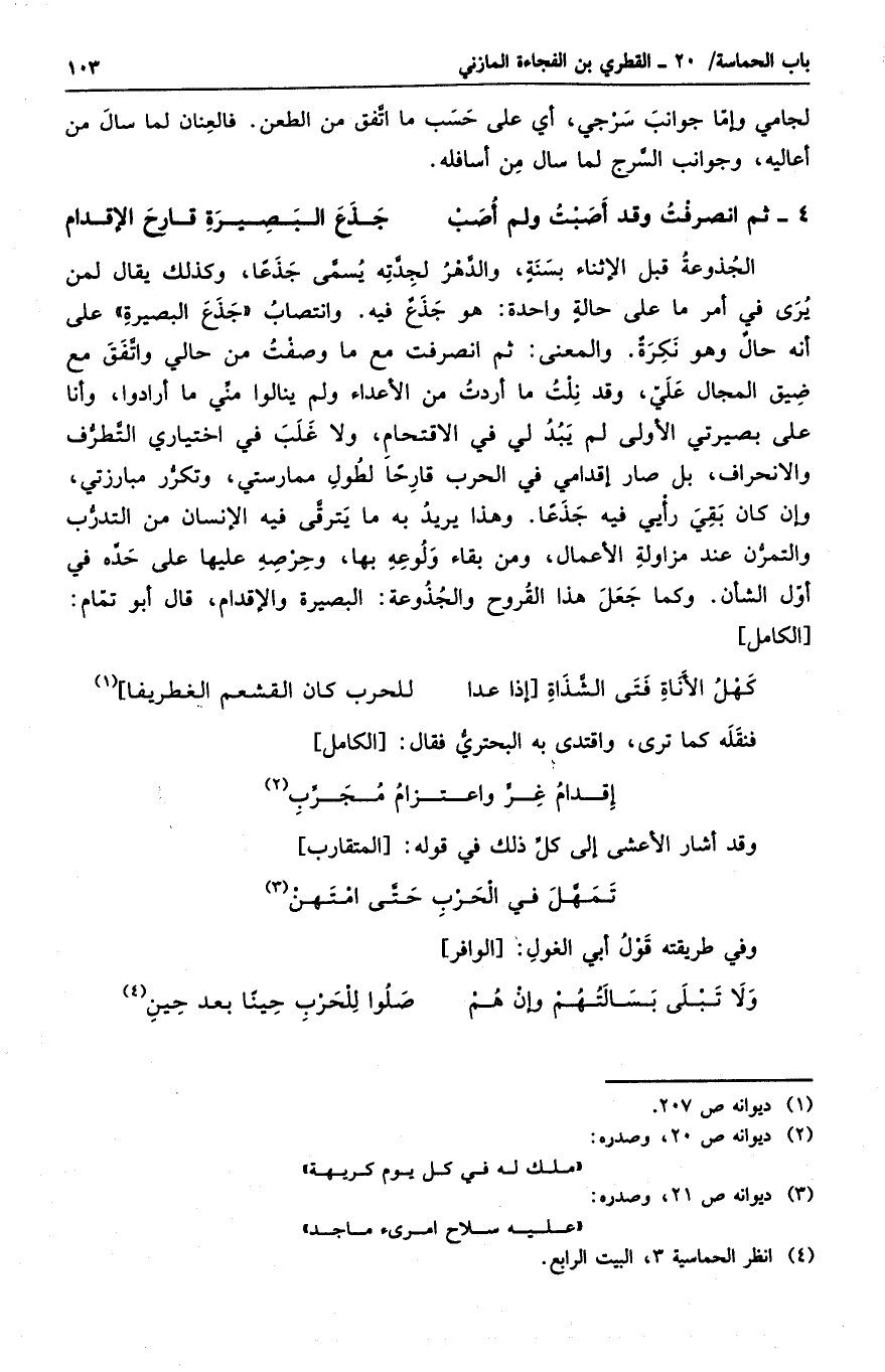 الجذوعة قبل الإثناء بسنةٍ، والدهر لجدته يسمى جذعاً، وكذلك يقال لمن يرى في أمر على حالةٍ واحدة: هو جذعٌ فيه. وانتصاب جذع البصيرة على أنه حالٌ وهو نكرةٌ. والمعنى ثم انصرفت مع ما وصفت من حالي واتفق مع ضيق المجال علي، وقد نلت ما أردت من الأعداء ولم ينالوا مني ما أرادوا، وأناعلى بصيرتي الأولى لم يبد لي في الاقتحام، ولا غلب في اختياري التطرف والانحراف، بل صار إقدامي في الحرب قارحاً لطول ممارستي، وتكرر مبارزتي، وإن كان بقي رأيي فيه جذعاً. وهذا يريد به ما يترقى فيه الإنسان من التدرب والتمرن عند مزوالة الأعمال، ومن بقاء ولوعه بها، وحرصه عليها على حده في أول الشأن. وكما جعل هذا القروح والجذوعة: البصيرة والإقدام، قال أبو تمام: