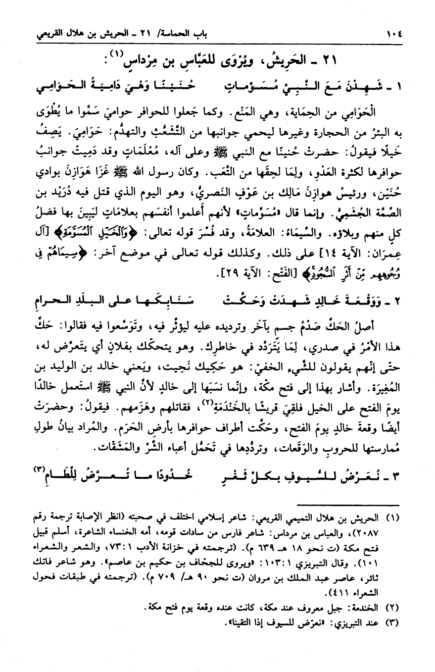 الحوامي من الحماية، وهي المنع. وكما جعلوا للحوافر حوامي سموا ما بطوى به البئر من الحجارة وغيرها ليحمي جوانبها من التشعث والتهدم: حوامي. يصف خيلاً فيقول: حضرت حنيناً مع النبي، صلى الله عليه وسلم وعلى آله، معلماتٍ وقد دميت جوانب حوافرها لكثرة العدو، ولما لحقها من التعب. وكان رسول الله صلى الله عليه وسلم غزا هوازن بوادي حنين، ورئيس هوازن مالك بن عوفٍ النصري، وهو اليوم الذي قتل فيه دريد ابن الصمة الجشمي. وإنما قال مسوماتٍ لأنهم أعلموا أنفسهم بعلاماتٍ ليبين بها فضل كل منهم وبلاؤه. والسيماء: العلامة، وقد فسر قوله تعالى: " والخيل المسومة " على ذلك. وكذلك قوله تعالى في موضع آخر: " سماهم في وجوههم من أثر السجود ".