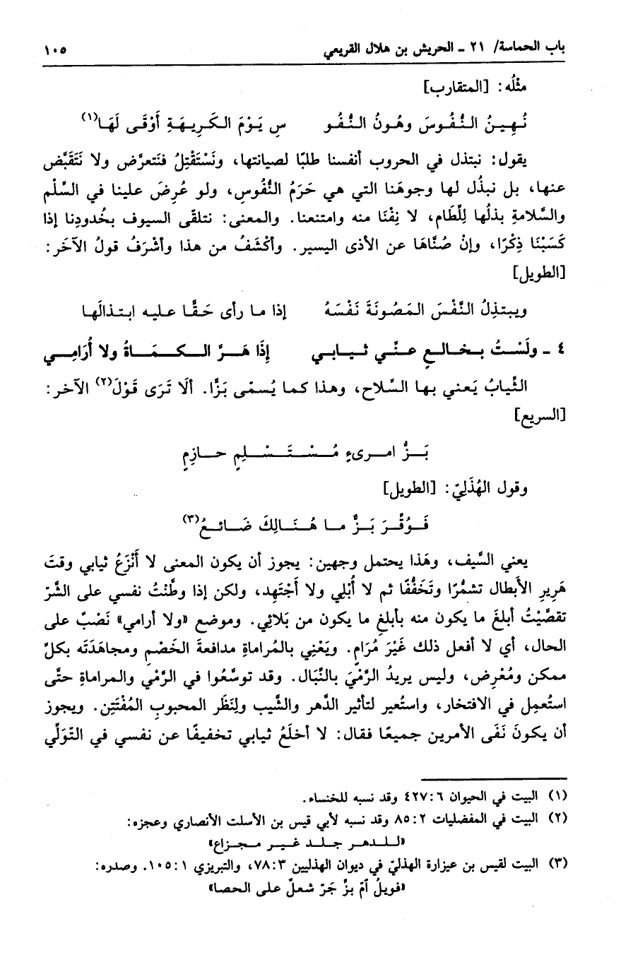 يعني السيف. وهذا يحتمل وجهين: يجوز أن يكون المعنى لا أنزع ثيابي وقت هرير الأبطال تشمراً وتخففاً ثم لا أبلي ولا أجتهد، ولكن إذا وطنت نفسي على الشر تقصيت أبلغ ما يكون منه بأبلغ ما يكون من بلائي. وموضع ولا أرامي نصبٌ على الحال، أي لا أفعل ذلك غير مرامٍ. ويعني بالمراماة مدافعة الخصم ومجاهدته بكل ممكن ومعرض. وليس يريد الرمي بالنبال. وقد توسعوا في الرمي والمراماة حتى استعمل في الافتخار، واستعير لتأثير الدهر والشيب ولنظر المحبوب المفتتن. ويجوز أن يكون نفي الأمرين جميعاً فقال: لا أخلع ثيابي تخفيفاً عن نفسي من التولي