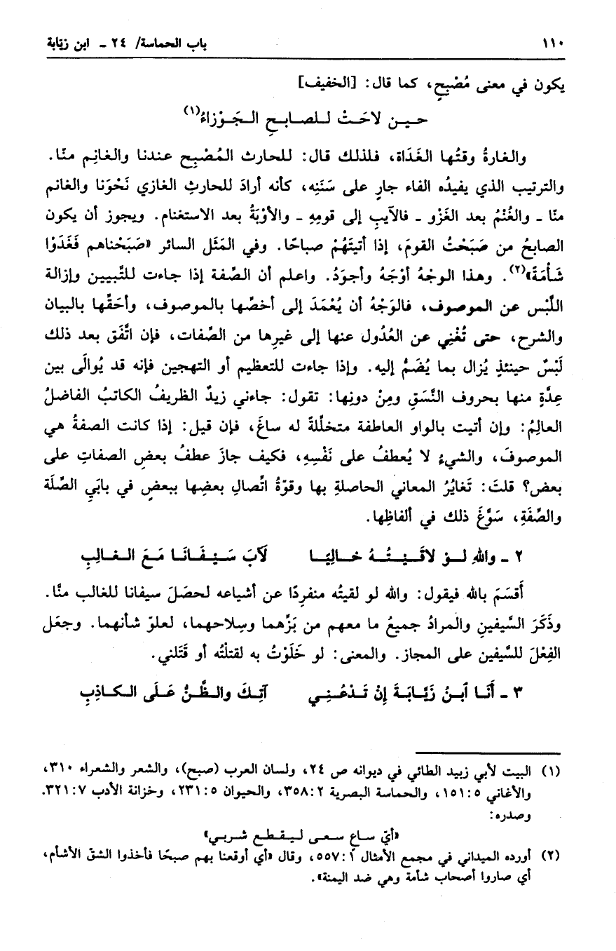 والغارة وقتها الغداة، فلذلك قال: للحارث المصبح عندنا والغانم منا. والترتيب الذي يفيده الفاء جارٍ على سننه، كأنه أراد للحارث الغازي نحونا والغانم منا - والغنم بعد الغزو - فالآيب إلى قومه - والأوبة بعد الاستغنام. ويجوز أن يكون الصابح من صبحت القوم، إذا أتيتهم صباحاً. وفي المثل السائر صبحناهم فغدوا شأمةً. وهذا الوجه أوجه وأجود. واعلم أن الصفة إذا جاءت للتبيين وإزالة اللبس عن الموصوف، فالوجه أن يعمد إلى أخصها بالموصوف، وأحقها بالبيان والشرح، حتى تغني عن العدول عنها إلى غيرها من الصفات. فإن اتفق بعد ذلك لبسٌ حينئذٍ يزال بما يضم إليه. وإذا جاءت للتعظيم أو التهجين فإنه قد يوالي بين عدةٍ منها بحروف النسق ومن دونها: تقول: جاءني زيدٌ الظريف الكاتب الفاضل العالم: وإن أتيت بالواو العاطفة متخللةً له ساغ، فإن قيل: إذا كانت الصفة هي الموصوف، والشيء لا يعطف على نفسه، فكيف جاز عطف بعض الصفات على بعض؟ قلت: تغاير المعاني الحاصلة بها وقوة اتصال بعضها ببعضٍ في بابي الصلة والصفة، سوغ ذلك في ألفاظها.