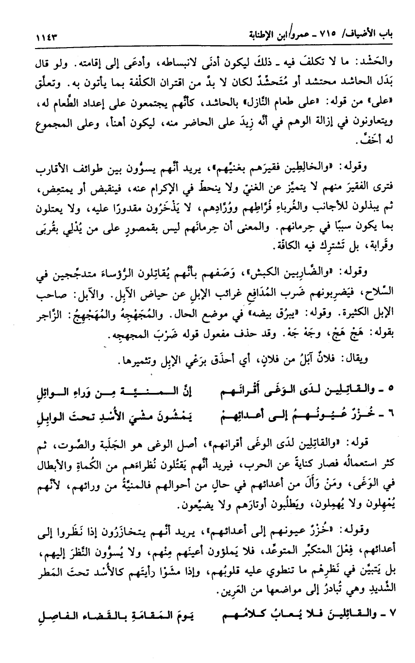 وقوله " والخالطين فقيرهم بغنيهم "، يريد أنهم يسوؤن بين طوائف الأقارب فترى الفقير منهم لايتميز عن الغني ولا ينحط في الإكرام عنه، فينقبض أو يمتعض، ثم يبذلون للأجانب والغرباء فراطهم وورادهم، لايذخرون وقدوراً عليه، ولا يعتلون بما يكون سببا في حرمانهم. والمعنى أن حرمانهم ليس بمقصور على ما يدلي بقربي وقرابة، بل تشترك فيه الكافة.