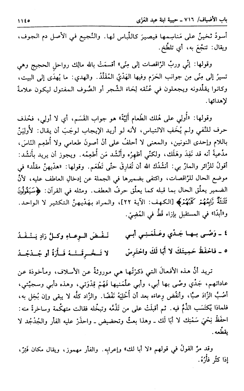 وقولها أولى على هلك الطعام ألية هو جواب القسم، أي لا أولى، فحذف حرف للنفي ولم يخف الالتباس، لأنه لو أريد الإيجاب لوجب أن يقال: لأولين باللام وإحدى النونين، والمعنى لا أحلف على أن أصون طعامي ولا أطعم الناس، مدعية أنه قد نفد وهلك، ولكني أظهره وأنشد من أطعمه. ويجوز أن يريد بأنشد: أقول للزائر والماربي: أنشدك الله أن تفارق حتى تطعم. وقولها هديهن مقلد في موضع الحال للراقصات، وامتفى بضميرها في الجملة عن إدخال العاطف عليه، لأن الضمير يعلق الحال بما قبله كما يعلق حرف العطف. ومثله في القرآن: " سقولون ثلاثة رابعهم كلبهم "، والمراد بهديهن التكثير لا الواحد. وأبدا في المستقبل بإزاء قط في المضي.