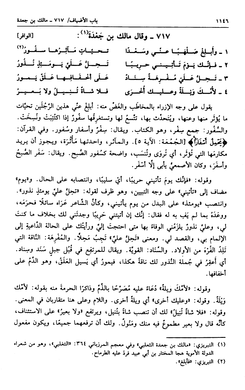 وقوله لأمك ويلة دعاء عليه مصرحاً بالذم وذاكراً الحرمة منه بقوله لأمك ويلة. وقوله وعليك أخرى أي ويلة أخرى. واللام وعلى هنا متقاربان في المعنى. وقوله فلا شاة تنيل لك أن تنصب شاة بتنيل، ويرتفع ولا بعير على الاستئناف، كأنه قال ولا بعير مطموع فيه منك ومنول. ولك أن ترفعهماجميعاص، ويكون مفعول
