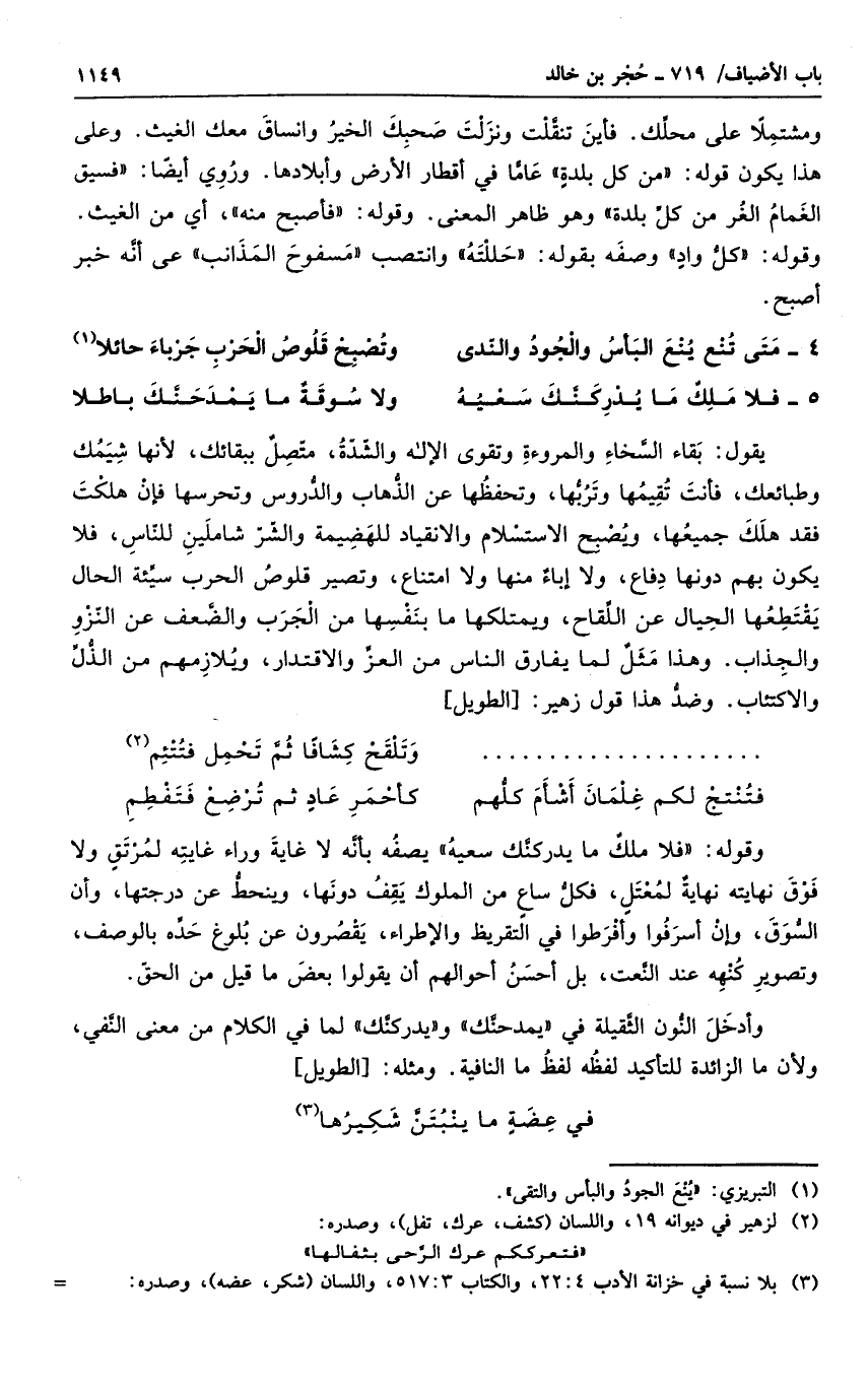 يقول: بقاء السخاء والمروءة وتقوى الإله والشدة، متصل ببقائك، لأنها شيمك وطبائعك، فأنت تقيمها وتربها، وتحفظها عن الذهاب والدروس وتحرسها فإن هلكت فقد هلك جميعها، ويصبح الاستسلام والانقياد لهضمية والشر شاملين للناس، فلا يكون بهم دونها دفاع، ولا إباء منها ولا امتناع، وتصير قلوص الحرب سيئة الحال يقتطعها الحيال عن اللقاح، ويمتلكها ما بنفسها من الجرب والضعف عن النزو والجذاب. وهذا مثل لما يفارق الناس من العز والاقتدار، ويلازمهم من الذل والاكتئاب. وضد هذا قول زهير: