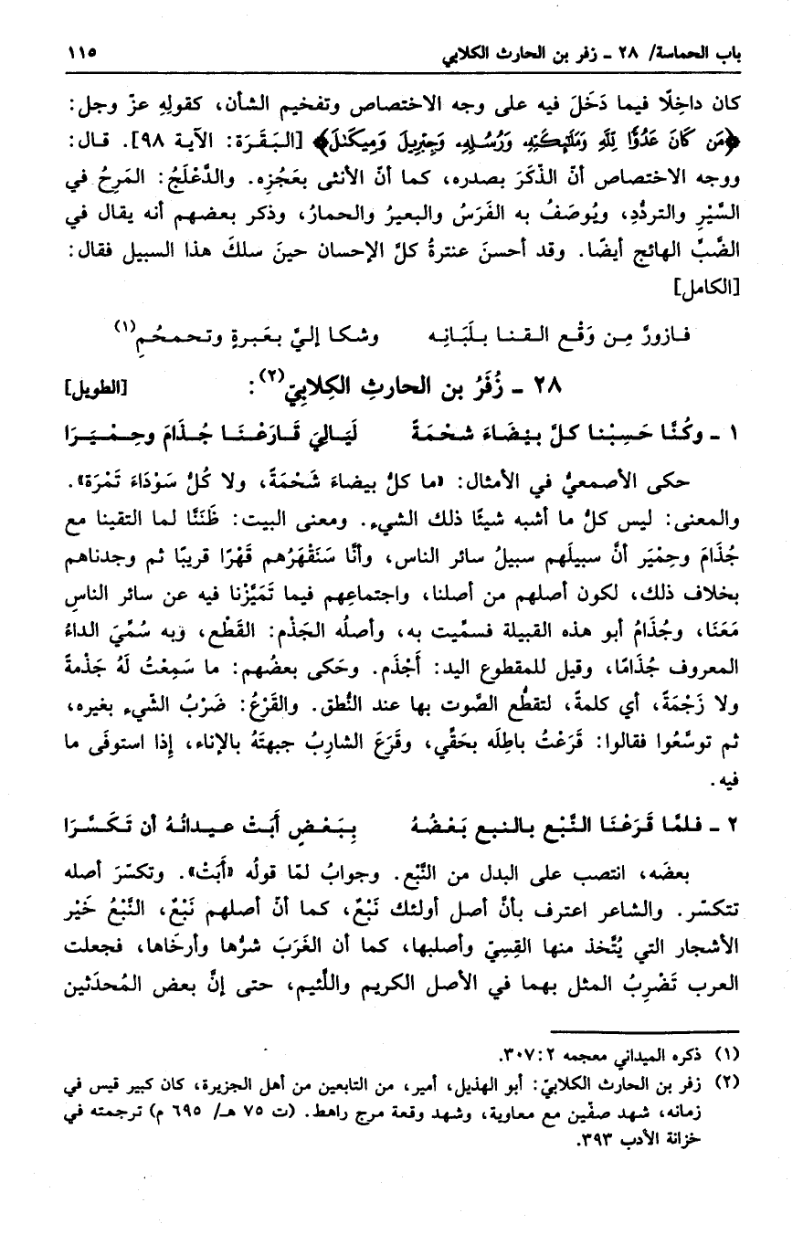 حكى الأصمعي في الأمثال: ما كل بيضاء شحمةً، ولا كل سوداء تمرة. والمعنى: ليس كل ما أشبه شيئاً ذلك الشيء. ومعنى البيت: ظننا لما التقينا مع جذام وحمير أن سبيلهم سبيل سائر الناس، وأنا سنقهرهم قهراً قريباً ثم وجدناهم بخلاف ذلك، لكون أصلهم من أصلنا. واجتماعهم فيما تميزنا فيه عن سائر الناس معنا، وجذام أبو هذه القبيلة فسميت به، وأصله الجذم: القطع، وبه سمي الداء المعروف جذاماً، وقيل للمقطوع اليد: أجذم. وحكى بعضهم: ما سمعت له جذمةً ولا زجمةً، أي كلمةً، لتقطع الصوت بها عند النطق. والقرع: ضرب الشيء بغيره، ثم توسعوا فقالوا: قرعت باطله بحقي، وقرع الشارب جبهته بالإناء إذا استوفى ما فيه.