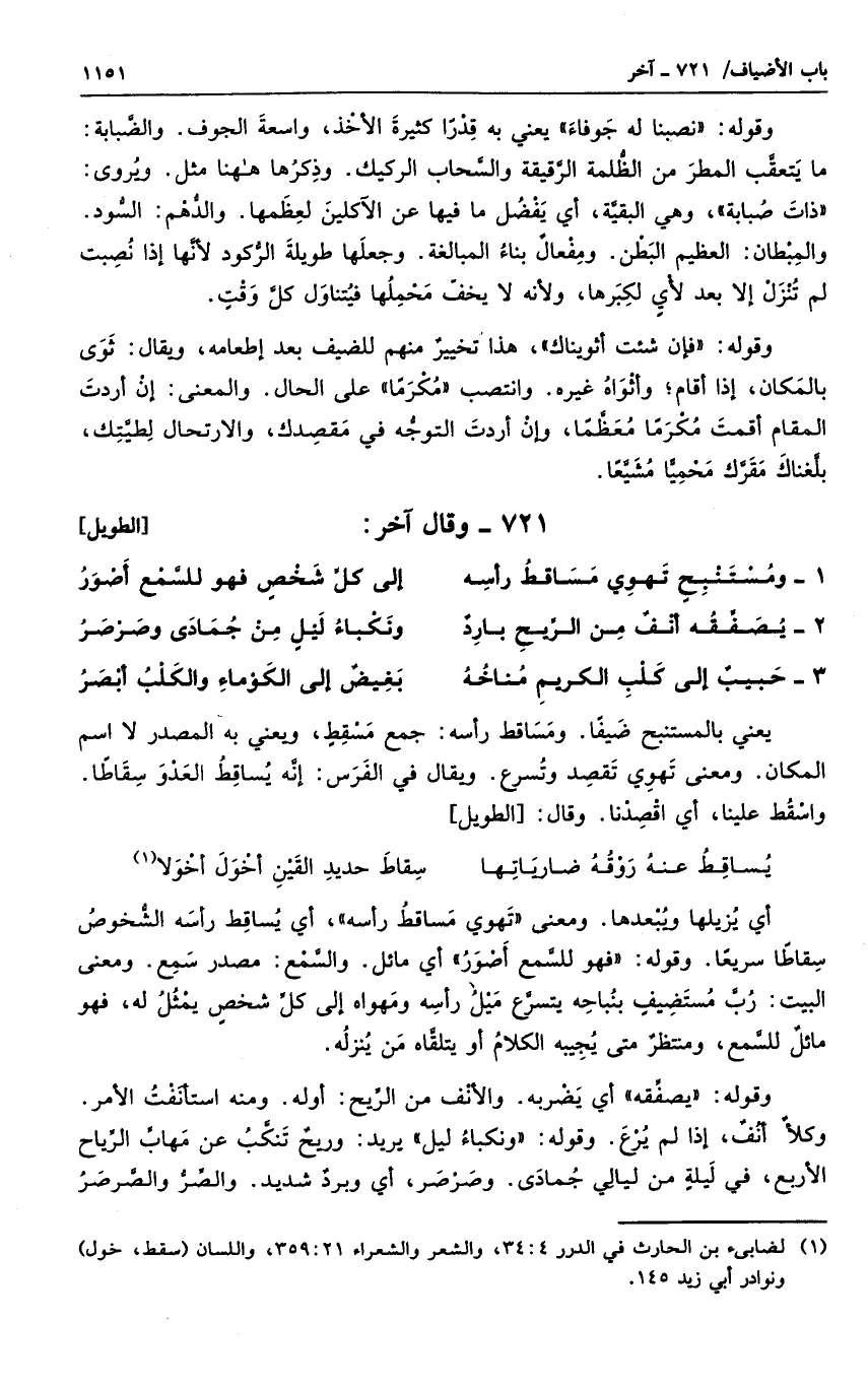 أي يزيلها ويبعدها. ومعنى تهوي مساقط رأسه، أي يساقط رأسه الشخوص سقاطاً سريعاً. وقوله فهو للسمع أصور أي مائل. والسمع: مصدر سمع. ومعنى البيت: رب مستضيف بنباحه يتسرع ميل رأسه ومهواه إلى كل شخص يمثل له، فهو مائل للسمع، ومنتظر متى يجيبه الكلام أو يتلقاه من ينزله.