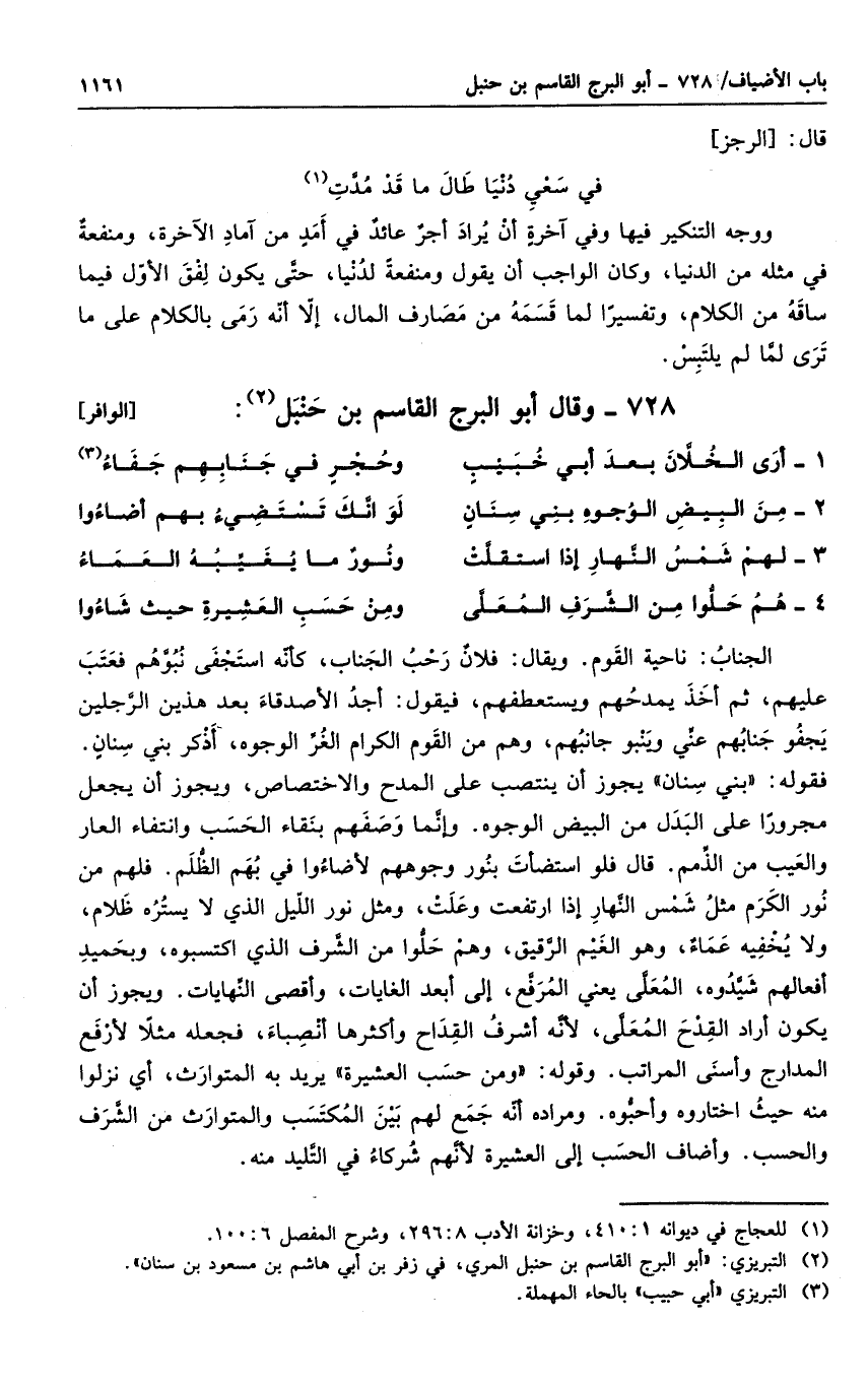 الجناب: ناحية القوم. ويقال: فلان رحب الجناب، كأنه استجفى نبوهم فعتب عليهم، ثم أخذ يمدحهم ويستعطفهم، فيقول: أجد الأصدقاء بعد هذين الرجلين يجفو جنابهم عني وينبو جانبهم، وهم من القوم الكرام الغر الوجوه، أذكر بني سنان. فقوله بني سنان يجوز أن ينتصب على المدح والاختصاص، ويجوز أن يجعل مجروراً على البدل من البيض الوجوه. وإنما وصفهم بنقاء الحسب وانتفاء العار والعيب من الذمم. قال: فلو استضأت بنور وجوههم لأضاءوا في بهم الظلم، فلهم مننور الكرم مثل شمس النهار إذا ارتفعت وعلت، ومثل نور الليل لا يستره ظلام، ولا يخفيه عماء، وهو الغيم الرقيق، ومثل نور الليل الذي اكتسبوه، ويحميد أفعالهم شيدوه، المعلى يعني المرفع، إلى أبعد الغايات، وأقصى النهايات. ويجوز أن يكون أراد القدح المعلى، لأنه أشرف القداح وأكثرها أنصباء، فجعله مثلاً لأرفع المدارج وأسنى المراتب. وقوله ومن حسب العشيرة يريد به المتوارث، أي نزلوا منه حيث اختاروه وأحبوه. ومراده أنه جمع لهم بين المكتسب والمتوارث من الشرف ةالحسب. وأضاف الحسب إلى العشيرة لأنهم شركاء في التليد منه.