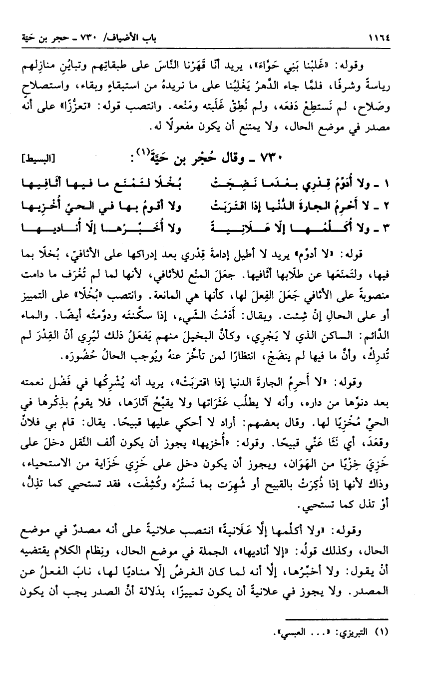 قوله لا أدوم يريد لا أطيل إدامة قدري بعد إدراكها على الأثافي، بخلاً بما فيها، ولتمنعها عن طلابها أثافيها. جعل المنع للأثافي، لأنها لما لم تغرف ما دامت منصوبة على الثافي جعل الفعل لها، كأنها هي المانعة. وانتصب بخلاً على التمييز أو على الحال إن شئت. ويقال: أدمت الشيء، إذا سكنته ودومته أيضاً. والماء الدائم: الساكن الذي لا يجري، وكأن البخيل منهم يفعل ذلك ليرى أن القدر لم تدرك، وأن ما فيها لم نضج، انتظاراً لمن تأخر عنه ويوجب الحال حضوره. وقوله لا أحرم الجارة الدنيا إذا اقتربت، يريد أنه يشركها في فصل نعمته بعج دنوها من داره، وأنه لا يطلب عثراتها ولا يقبح آثارها، فلا يقوم بذكرها في الحي مخزياً لها. وقال بعضهم: أراد لا أحكي عليها قبيحاً. يقال: قام بي فلان وقعد، أي نثا عني قبيحاً. وقوله أخزيها يجوز أن يكون ألف النقل دخل على خزي خزياً من الهوان، ويجوز أن يكون دخل على خزي خزاية من الاستحياء، وذاك لأنها إذا ذكرت بالقبيح أو شهرت بما تستره وكشفت، فقد تستحيي كما تذل، أو تذل كما تستحيي.