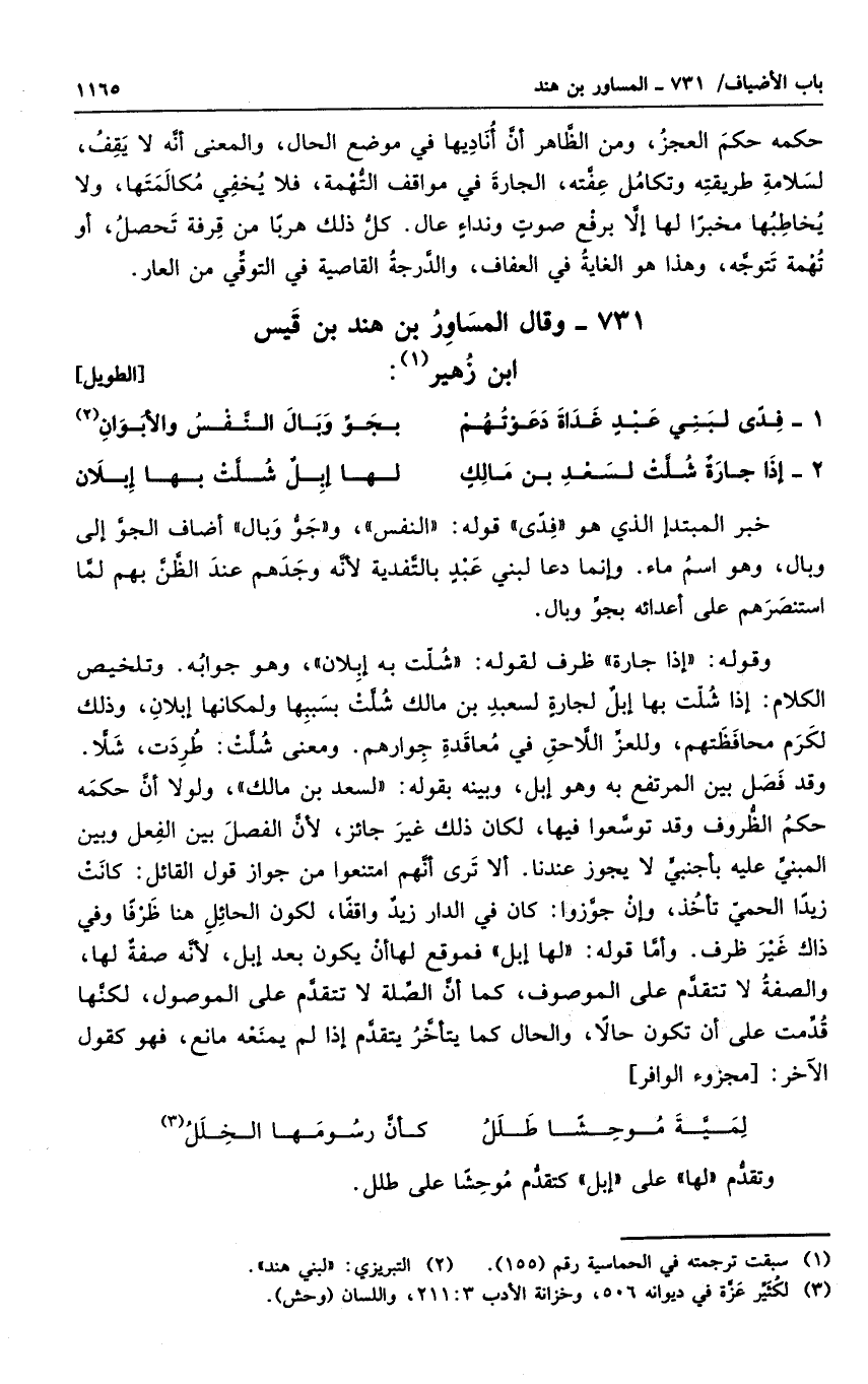 خبر المبتدأ الذي هو فدي قوله النفس، وجو وبال أضاف الجو إلى وبال، وهو اسم ماء. وإنما دعا لبني عبد بالتفدية لأنه وجدهم عند الظن بهم لما استنصرهم على أعدائه بجو وبال. وقوله إذا جارة ظرف لقوله شلت به غبلان، وهو جوابه. وتلخيص الكلام: إذا شلت إبل لجارة لسعد بن مالك شلت بسببها ولمكانها إبلان، وذلك لكرم محافظتهم، وللعز اللاحق في معاقدة جوارهم. ومعنى شلت: طردت، شلا. وقد فصل بين المرتفع به وهو إبل، وبينه بقوله لسعد بن مالك، ولولا أن حكمه الظروف وقد توسعوا فيها، لكان ذلك غير جائز، لأن الفصل بين الفعل وبين المبنى عليه بأجنبي لا يجوز عندنا. ألا ترى أنهم امتنعوا من جواز قول القائل: كانت زيداً الحمي تأخذ، وإن جوزوا: كان في الدار زيد واقفاً، لكون الحائل هنا ظرفاً وفي ذاك غير ظرف. وأما قوله لها إبل فموقع لها أن يكون بعد إبل، لأنه صفة لها، والصفة لا تتقدم على الموصوف، كما أن الصلة لا تتقدم على الموصول، لكنها قدمت على ان تكون حالاً، والحال كما يتأخر يتقدم إذا لم يمنعه مانع، فهو كقول الآخر: