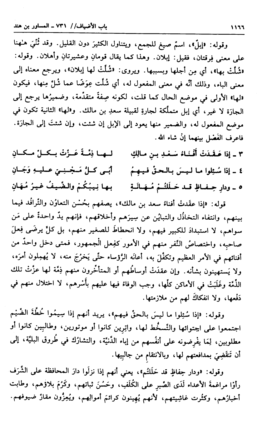وقوله إبل، اسم صيغ للجمع، ويتناول الكثير دون القليل. وقد ثنى هاهنا على فرقتان، فقيل إبلان. وهذا كما يقال قومان ةعشيرتان وأهلان. وقوله شلت بها، أي من أجلها وبسببها. ويروى: شت لها إبلان، ويرجع معناه إلى معنى الباء، وذلك لأنه في معنى المفعول له، أي شلت عوضاً عما شل منها، فيكزن لها الأولى في موضع الحال كما قلت، لكونه صفة متقدمة، وضميرها يرجع إلى الجارة لا غير، أي إبل متملكة لجارة لقبيلة سعد بن مالك. ولها الثانية تكون في موضع المفعول له، والضمير منها يعود إلى الإبل إن شئت، وإن شئت إلى الجارة. فاعرف الفصل بينهما إن شاء الله.