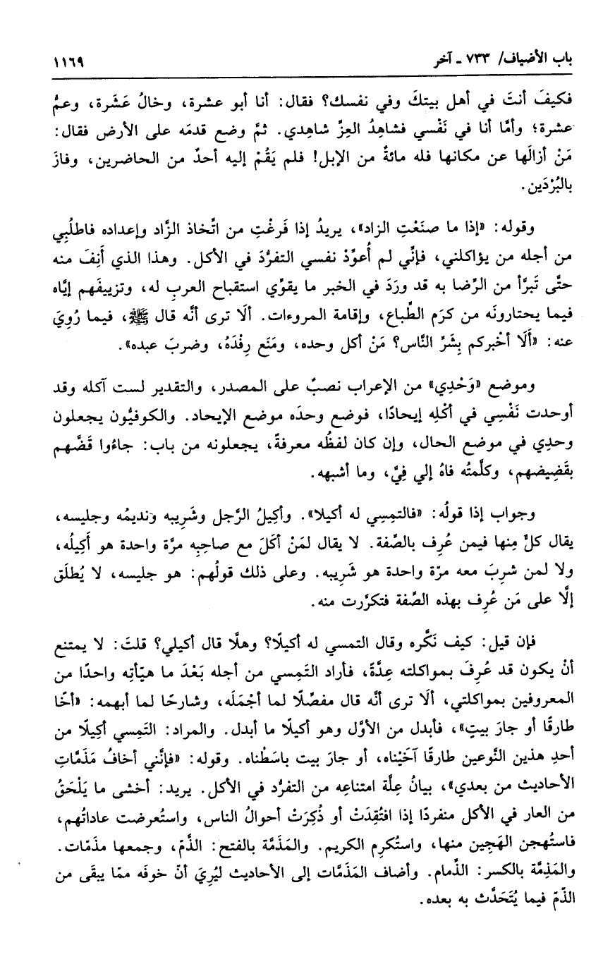 وقوله إذا ما صنعت الزاد، يريد إذا فرغت من اتخاذ الزاد وإعداده فاطلبي من أجله من يؤاكلني، فإني لم أعود نفسي التفرد في الأكل. وهذا الذي أنف منه حتى تبرأ من الرضا به قد ورد في الخبر ما يقوى استقباح العرب له، وتزييفهم إياه فيما يختارونه من كرم الطباع، وإقامة المروءات. ألا ترى أنه قال صلى الله عليه وسلم، فيما روى عنه: " ألا أخبركم بشر الناس؟ من اكل وحده، ومنع رفده، وضرب عبده ".