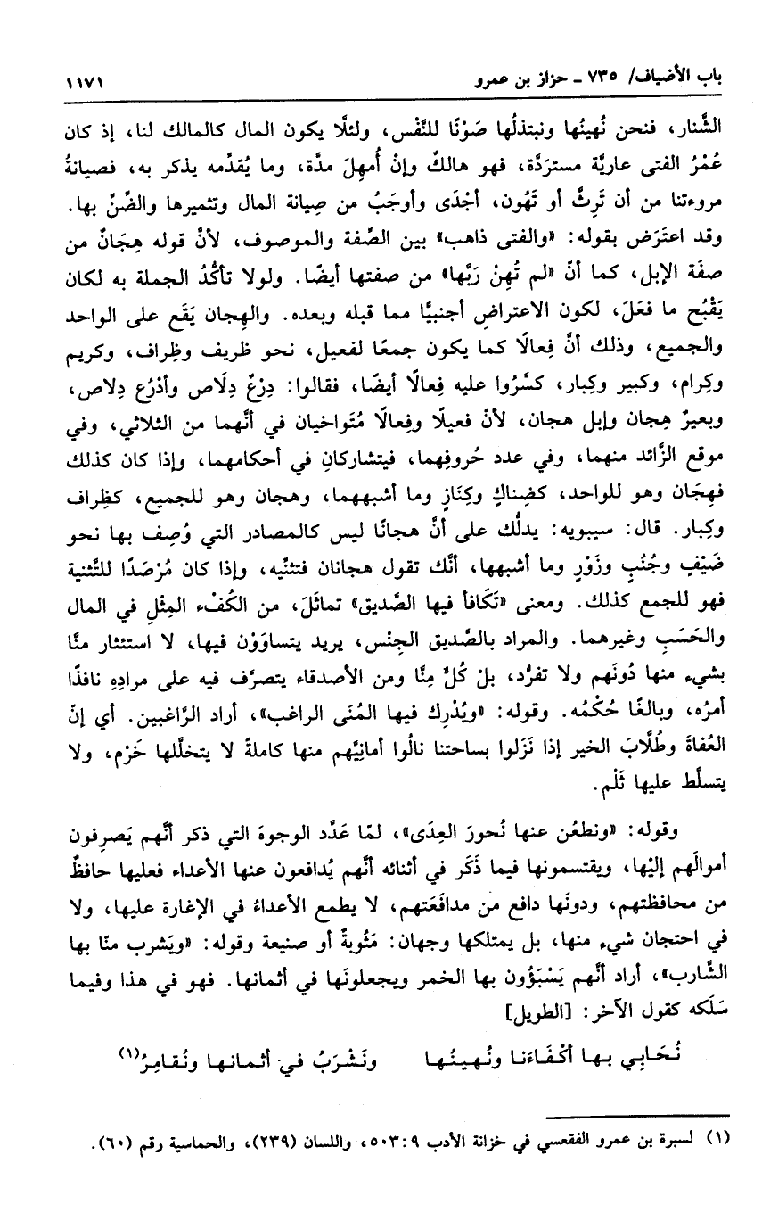 الشنار، فنحن نهينها ونبتذلها صوناً للنفس، ولئلا يكون المال كالمالك لنا، إذ كان عمر الفتى عارية مستردة، فهو هالك وإن أمهل مدة، وما يقدمه يذكر به، فصيانة مروءتنا من أن ترث أو تهون، أجدى وأوجب من صيانة المال وتثميرها والضن بها. وقد اعترض بقوله والفتى ذاهببين الصفة والموصوف، لأن قوله هجان من صفة الإبل، كما ان لم تهن ربها من صفتها أيضاً. ولولا تأكد الجملة به لكان يقبح مافعل، لكون الاعتراض أجنبياً مما قبله وبعده. والهجان يقع على الواحد والجميع، وذلك أن فعالاً كما يكون جمعاً لفعيل، نحو ظريف وظراف، وكريم وكرام، وكبير وكبار، كسروا عليه فعالاً أيضاً، فقالوا: درع دلاص وأدرع دلاص، وبعير هجان وإبل هجان، لأن فعيلاً متواخيان في أنهما من الثلاثي، وفي موقع الزائد منهما، وفي عدد حروفهما، فيتشاركان في أحكامهما، وإذا كان كذلك فهجان وهو للواحد، كضناك وكناز وماأشبههما، وهجان وهو للجميع، كظراف وكبار. وقال: سيبويه: يدلك على أن هجاناً ليس كالمصادر التي وصف بها نحو ضيف وجنب وزور وماأشبهها، أنك تقول هجانان فتنتيه، وإذا كان مرصداً للتثنية فهو للجمع كذلك. ومعنى تكافأ فيها الصديق تماثل، من الكفء المثل في المال والحسب وغيرهما. والمراد بالصديق الجنس، يريد يتساؤون فيها، لا استئثار منا بشيء منها دونهم ولا تفرد، بل كل منا ومن الأصدقاء يتصرف فيه على مراده نافذاً أمره، وبالغاً حكمه. وقوله ويدرك فيها المنى الراغب، أراد الراغبين، أي إن العفاة وطلاب الخير إذا نزلوا بساحتنا نالوا أمانيهم منها كاملة لا يتخللها خرم، ولا يتسلط عليها ثلم.