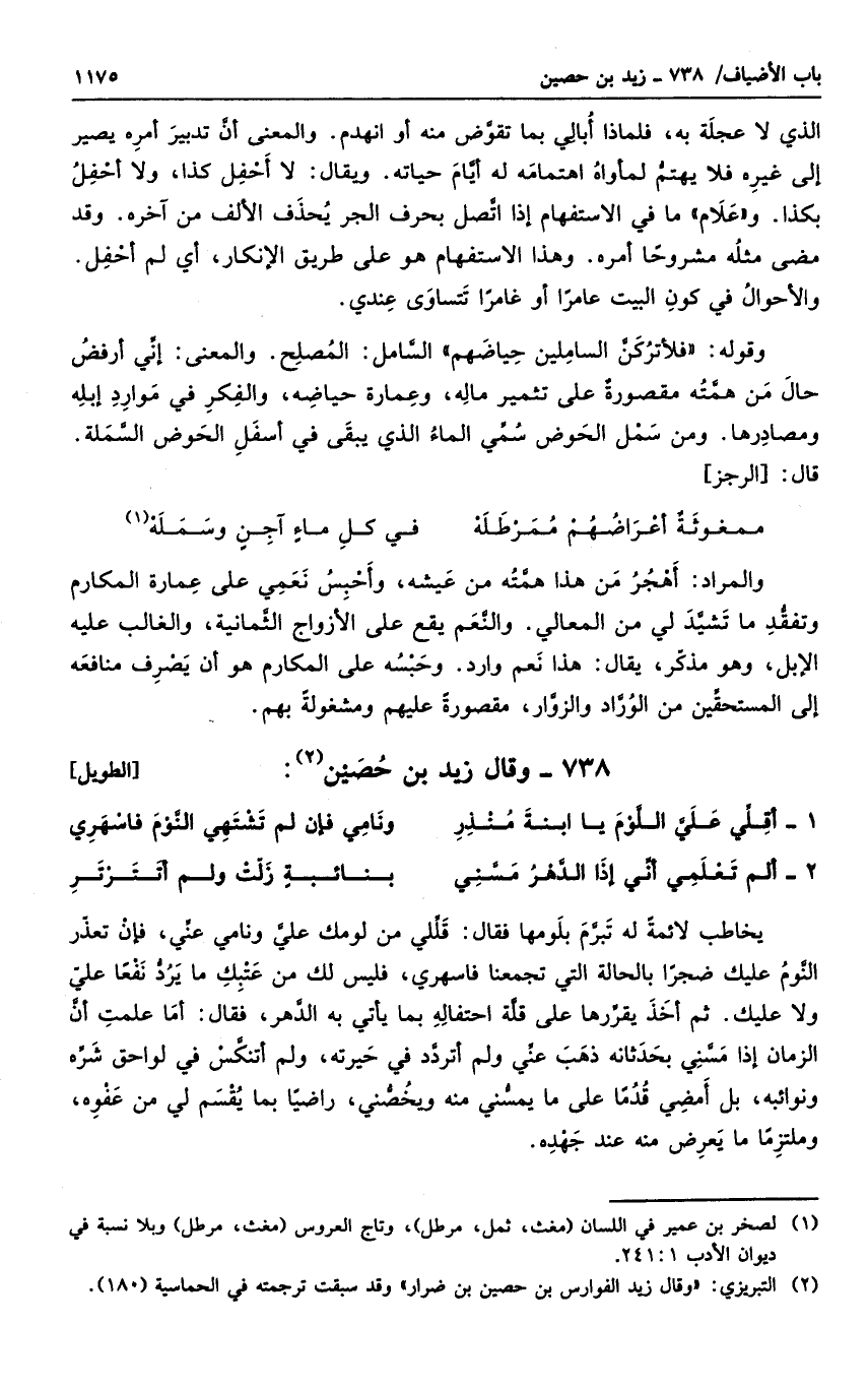 يخاطب لائمة له تبرم بلومها فقال: قللي من لومك علي ونامي عني، فإن تعذر النوم عليك ضجراً بالحالة التي تجمعنا فاسهري، فليس لك من عتبك مايرد نفعاً علي ولا عليك. ثم أخذ يقررها على قلة احتفاله بما يأتي به الدهر، فقال: أما علمت أن الزمان إذا مسني بحدثانه ذهب عني ولم أتردد في حيرته، ولم أتنكس في لواحق شره ونوائبه، بل أمضى قدماً على ما يمسني منه ويخصني، راضياً بما يقسم لي من عفوه، وملتزماً ما يعرض منه عند جهده.