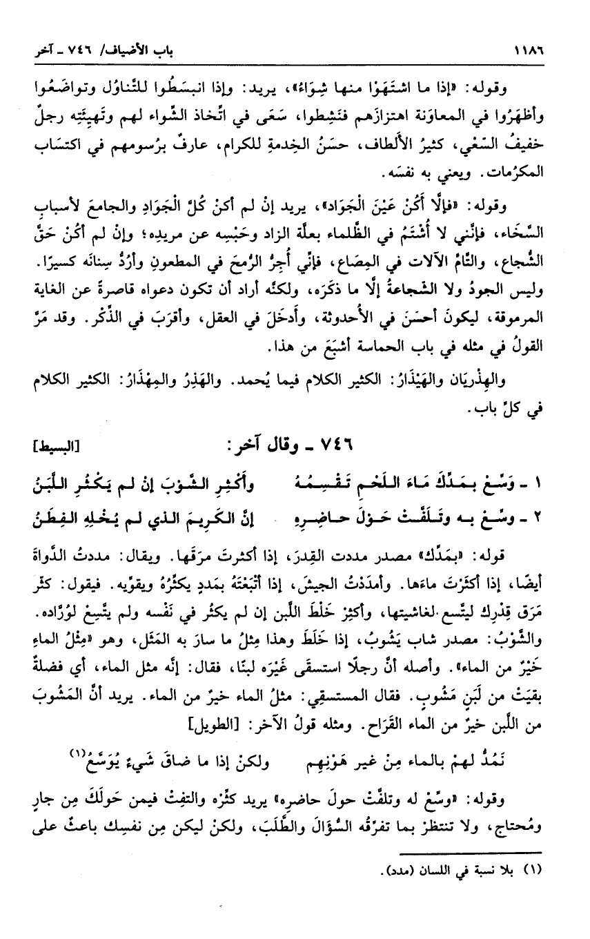 قوله بمدك مصدر مددت القدر، إذا أكثرت مرقها. ويقال: مددت الدواة أيضاً، إذا كثر مرق قدرك ليتسع لغاشيتها، وأكثر خلط اللبن إن لم يكثر في نفسه ولم يتسع لوارده. والشوب: مصدر شاب يشوب، إذا خلط وهذا مثل ما سار به المثل، وهو مثل الماء خير من الماء. وأصله أن رجلاً استسقى غيره لبناً، فقال: إنه مثل الماء، أي فضلة بقيت من لبن مشوب. فقال المستسقي: مثل الماء خير من الماء. يريد أن المشوب من اللبن خير من الماء القراح. ومثله قول الآخر: