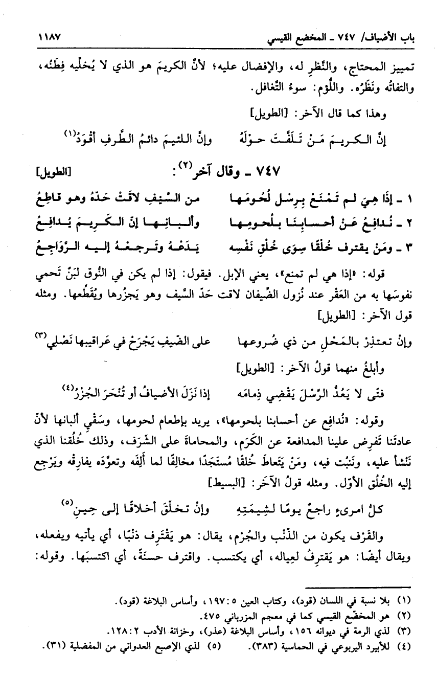 وقوله ندافع عن احسابنا بلحومها، يريد بإطعام لحومها، وسقى ألبانها لأن عادتنا تفرض علينا المدافعة عن الكرم، والمحاماة على الشرف، وذلك خلقنا الذي ننشأ عليه، وننبت فيه، ومن يتعاط خلقاً مستجداً مخالفاً لما ألفه وتعوده يفارقه ويرجع إليه الخلق الأول. ومثله قول الآخر: