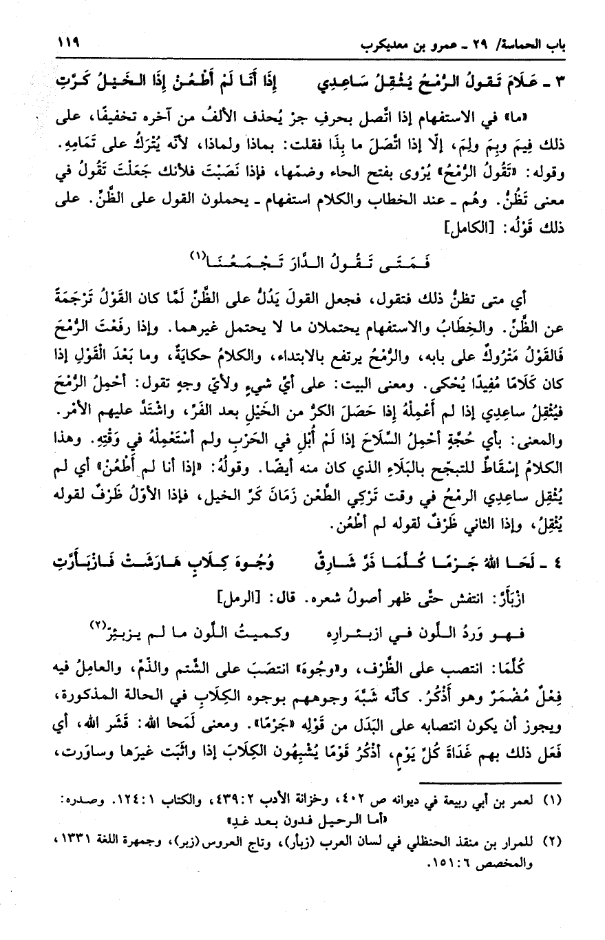 ما في الاستفهام إذا اتصل بحرف جر يحذف الألف من آخره تخفيفاً، على ذلك فبم وبم ولم، إلا إذا اتصل ما بذا فقلت: بماذا ولماذا، لأنه يترك على تمامه. وقوله: تقول الرمح يروى بفتح الحاء وضمها، فإذا نصبت فلأنك جعلت تقول في معنى تظن. وهم - عند الخطاب والكلام استفهام - يحملون القول على الظن. على ذلك قوله: