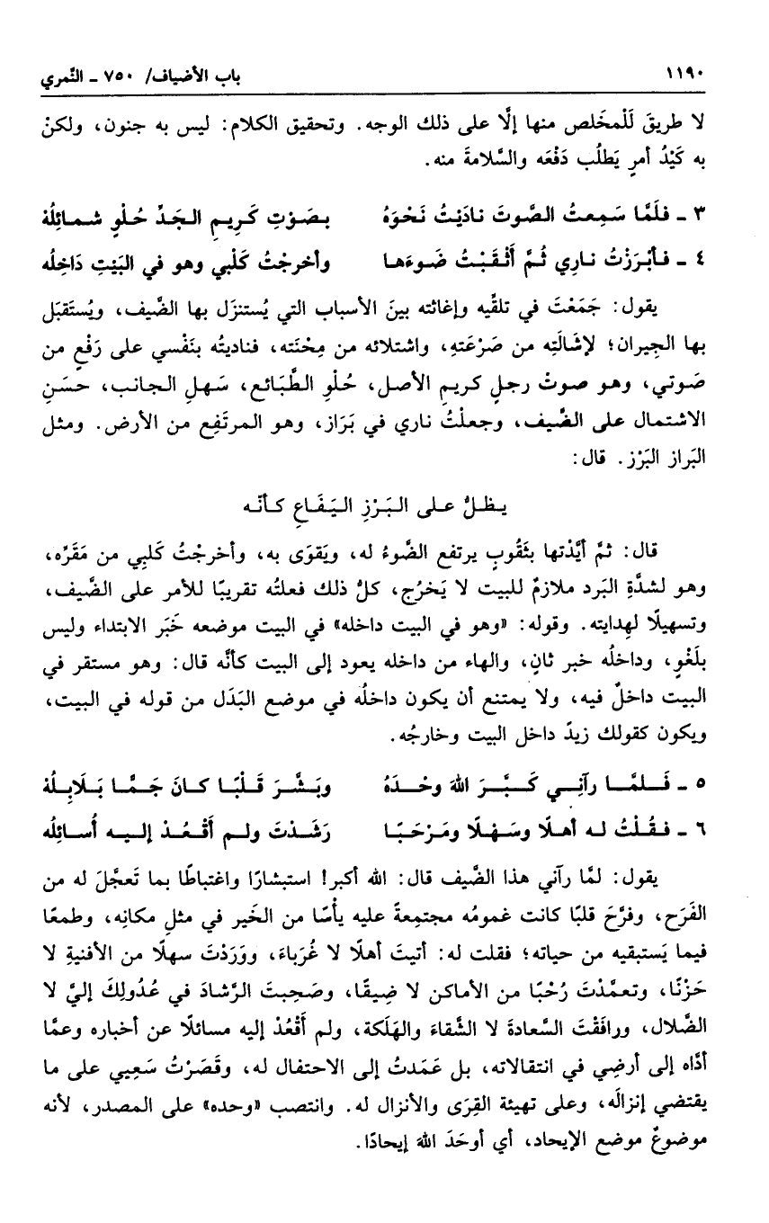 يقول: لما رآني هذا الضيف قال: الله أكبر! استبشاراً واغتباطاً بما تعجل له من الفرح، وفرح قلباً كانت غمومه مجتمعة عليه يأساً من الخير في مثل مكانه، وطمعاً فيما يستبقيه من حياته؛ فقلت له: أتيت أهلاً لا غرباء، ووردت سهلاً من الأفنية لا حزناً، وتعمدت رحباً من الأماكن لا ضيقاً، وصحبت الرشاد في عدولك إلى لا الضلال، ورافقت السعادة لا الشقاء والهلكة، ولم أقعد إليه مسائلاً عن أخباره وعما أداه إلى أرضي في انتقالاته، بل عمدت إلى الاحتفال له، وقصرت سعيي على ما يقتضيه إنزاله، وعلى تهيئة القرى والأنزال له. وانتصب وحده علىالمصدر، لأنه موضوع موضع الإيجاد، أي أوحد الله إيحاداً.
