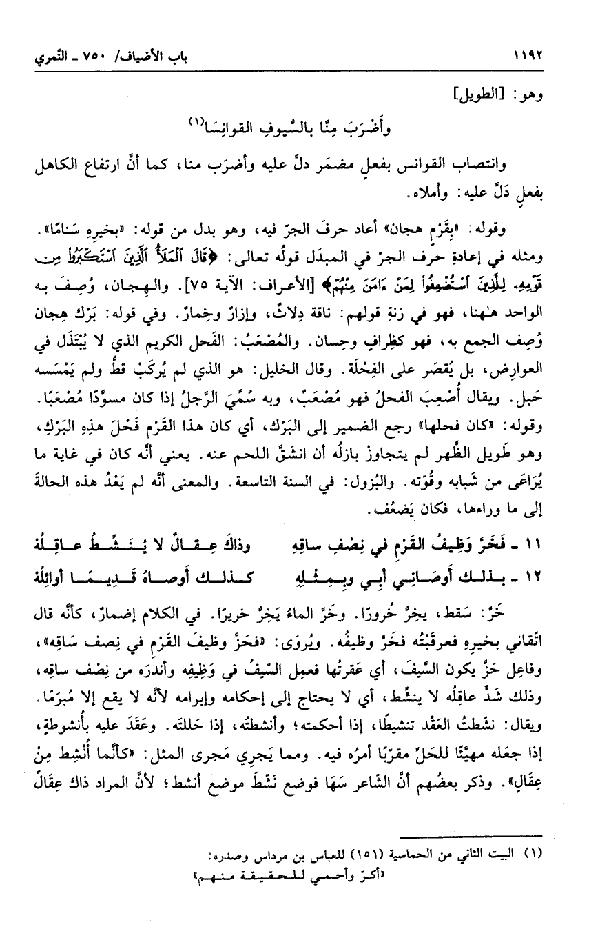 وانتصاب القوانس بفعل مضمر دل عليه وأضرب منا، كما ان ارتفاع الكاهل بفعل دل عليه: وأملاه. وقوله بقرم هجان أعاد حرف الجر فيه، وهو بدل من قوله: بخيره سناماً. ومثله في إعادة حرف الجر في المبدل قوله تعالى: " قال الذين استكبروا من قومه للذين استضعفوا لمن آمن منهم ". والهجان، وصف به الواحد هاهنا، فهو في زنة قولهم: ناقة دلاث، وخمار. وفي قوله برك هجان وصف الجمع به، فهو كظراف وحسان. والمصعب: الفحل الكريم الذي لا يبتذل في العوارض، بل يقصر على الفحلة. وقال الخليل: هو الذي لم يركب قط ولم يمسه حبل. ويقال أصعب الفحل فهو مصعب، وبه سمى الرجل إذا كان مسوداً مصعباً. وقوله كان فحلها رجع الضمير إلى البرك، أي كان هذا القرم فحل هذه البرك، وهو طويل الظهر لم يتجاوز بازله أن انشق اللحم عنه. يعني أنه كان في غاية ما يراعي من شبابه وقوته. والبزول: في السنة التاسعة. والمعنى أنه لم يعد هذه الحالة إلى ما وراءها، فكان يضعف.
