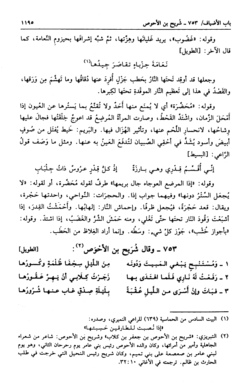 وقوله: إذا المرضع العوجاء جال بريمها ظرف لقوله محضرة، أو لقوله لا يجعل الستر دونها وفيهما جواب إذا. والحجرات: النواحي، واحدتها حجرة، ويقال: قعد حجرة، فيجعل ظرفاً. وإحماش النار: إلهابها. وأحمشت القدر، إذا أشبعت وقود النار تحتها حتى تغلى، ومنه حمش الشر والغضب، إذا اشتد. وقوله بأجواز خشب، جوز كل شيء: وسطه. وإنما أراد الغلاظ من الحطب.