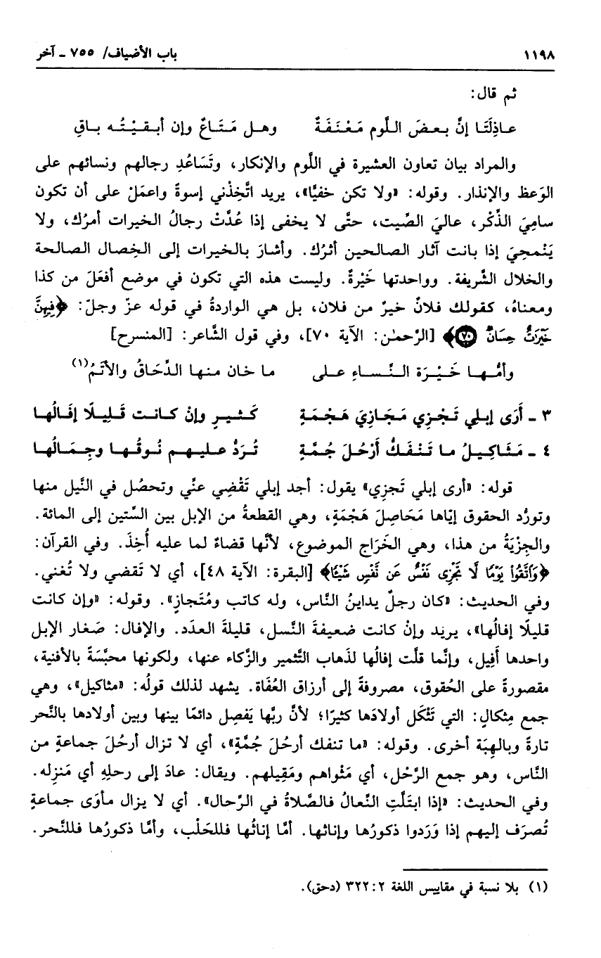 قوله أرى إبلي تجزي يقول: أجد إبلي تقضي عني وتحصل في النيل منها وتورد الحقوق إياها محاصل هجمة، وهي القطعة من الإبل بين الستين إلى المائة. والجزية من هذا، وهي الخراج الموضوع، لأنها قضاء لما عليه أخذ. وفي القرآن: " واتقوا يوماً لا تجزي نفس عن نفس شيئاً "، أي لا تقضي ولا تغنى. وفي الحديث: " كان رجل يداين الناس، وله كاتب ومتجاز ". وقوله: وإن كانت قليلاً إفالها، يريد وإن كانت ضعيفة النسل، قليلة العدد. والإفال: صغار الإبل واحدها أفيل، وإنما قلت إفالها لذهاب التثمير والزكاء عنها، ولكونها محبسة بالأفنية، مقصورة على الحقوق، مصروفة إلى أرزاق العفاة. يشهد لذلك قوله مثاكيل، وهي جمع مثكال: التي تثكل أولادها كثيراً؛ لأن ربها يفصل دائماً بينها وبين أولادها بالنحر تارة وبالهبة أخرى. وقوله ما تنفك أرحل جمة، أي لا تزال أرحل جماعة منزله. وفي الحديث: " إذا ابتلت النعال فالصلاة في الرحال ". أي لا يزال مأوى جماعة تصرف إليهم إذا وردوا ذكورها وإناثها. أما إناثها فللحلب، وأما ذكورها فللنحر.