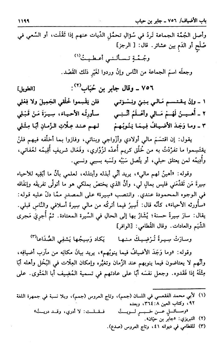 وقوله وما وجد الأضياف فيما ينوبهم، يريد بيان مكانه من مآرب أضيافه، وأنهم لا يعتاضون فيما ينوبهم عند الزمان وتغيره وإمكان العلات في البخل وأهله اباً مثله إذا فقدوه. وجعل نفسه أباً على عادتهم في تسمية المضيف أبا المثوى. على
