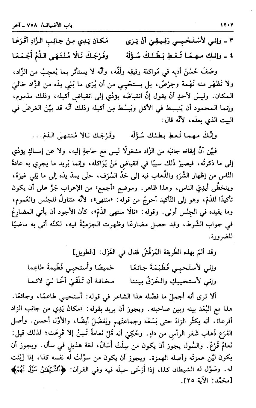 فبين أن إبقاءه جانبه من الزاد مشغولاً ليس مع حاجة إليه، ولا عن إمساك يؤدي إلى ما ذكرته، فيصير ذلك سبباً في إنقباض من يواكله، وإنما يريد ما يجري به من عادة الناس من إظهار الشره والذهاب فيه إلى حد السرف، حتى يمد يده إلى ما يلي غيره، ويتخطى أيدي الناس. وهذا ظاهر. وموضع أجمع من الإعراب جر على أن يكون تأكيداً للذم، وهو إلى التأكيد أحوج من قوله منتهى، لأنه متناول للجنس والعموم، وما يفيده في الجنس أولى. وقوله نالا منتهى الذم، كأن الأجود أن يأتي المضارع في جواب الشرط، وقد حصل مضارعاً وظهرت الجزمية فيه، لكنه أتى به ماضياً للضرورة.