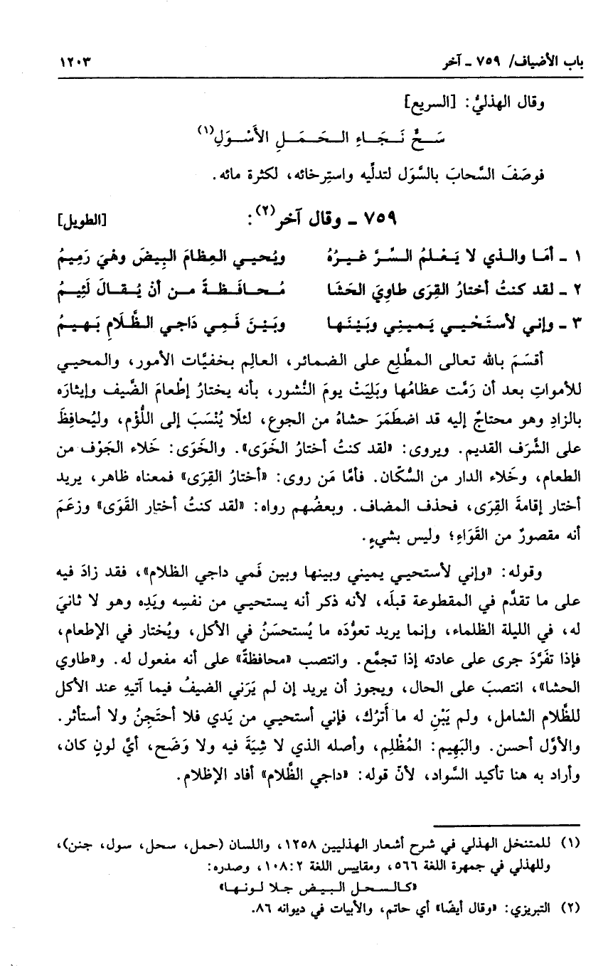 وقوله: وإني لأستحيي يميني وبينها وبين فمي داجي الظلام، فقد زاد فيه على ما تقدم في المقطوعة قبله، لأنه ذكر أنه يستحي من نفسه ويده وهو لا ثاني له، في الليلة الظلماء، وإنما يريد تعوده ما يستحسن في الأكل، ويختار في الإطعام، فإذا تفرد جرى على عادته إذا تجمع. وانتصب محافظة على أنه مفعول له. وطاوى الحشا، انتصب على الحال، ويجوز أن يريد إن لم يرني الضيف فيما آتيه عند الأكل للظلام الشامل، ولم يبن له ما أترك، فإنس أستحي م يدي فلا أحجن ولا أستأثر. والأول أحسن. والبهيم: الظلم، وأصله الذي لاشية فيه ولا وضح، أي لون كان، وأراد به هنا تأكيد السواد، لأن قوله داجي الظلام أفاد الإظلام.