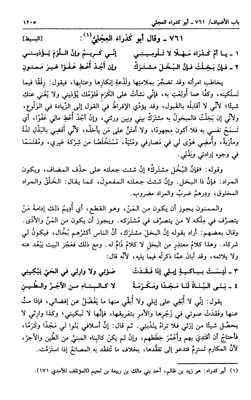 يخاطب امرأته وقد تضجر بملامتهاولذعة إنكارها وعتابها، فيقول: رفقاً فيما تسلكينه، وكفا عما أولعت به، فإني نشأت على الكرم فلومك يؤذيني ولا يغني عنك شيئاً؛ لأني لا أقابله بالقبول، وقد يؤدي الإفراط في القول إلى الزيادة في الولوع، ولأني إن بخلت فالمبخول به مشترك بيني وبين ورثتي، وإن أجد أعط مالي عفواً، أي تسمحنفسي نفسي به فلا أكون مجهوداً، ولا أمتن على من يأخذه، لأني أقضي بالبذل لذة ومأربة، وأمضى هوى لي في مصارف ومنية، مستخلصاً من شركة غيري، ومقتسماً في وجوه إرادتي وبذلي.