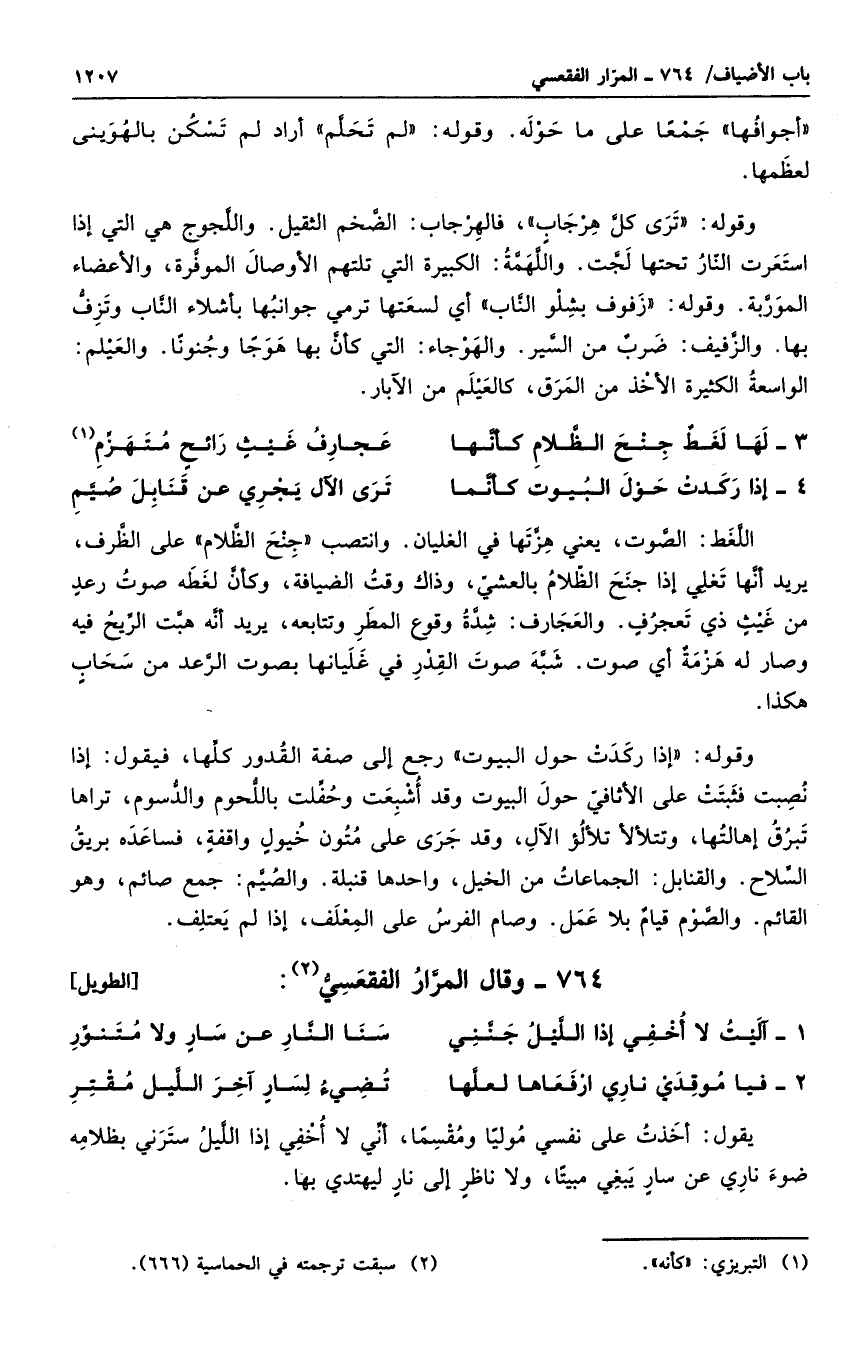 وقوله إذا ركدت حول البيوت رجع إلى صفة القدور كلها، فيقول: إذا نصبت فتثبتت على الأثافي حول البيوت وقد أشبعت وحفلت باللحوم والدسوم، تراها تبرق إهالتها، وتتلألأ تلألؤ الآل، وقد جرى على متون خيول واقفة، فساعده بريق السلاح. والقنابل: الجماعات من الخيل، حدها قنبلة. والصيم: جمع صائم، وهو القائم. والصوم قيام بلا عمل. وصام الفرس على المعلف، إذا لم يعتلف.