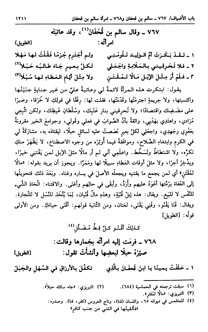 وقال سالم بن قحفان، وقد عاتبته امرأته