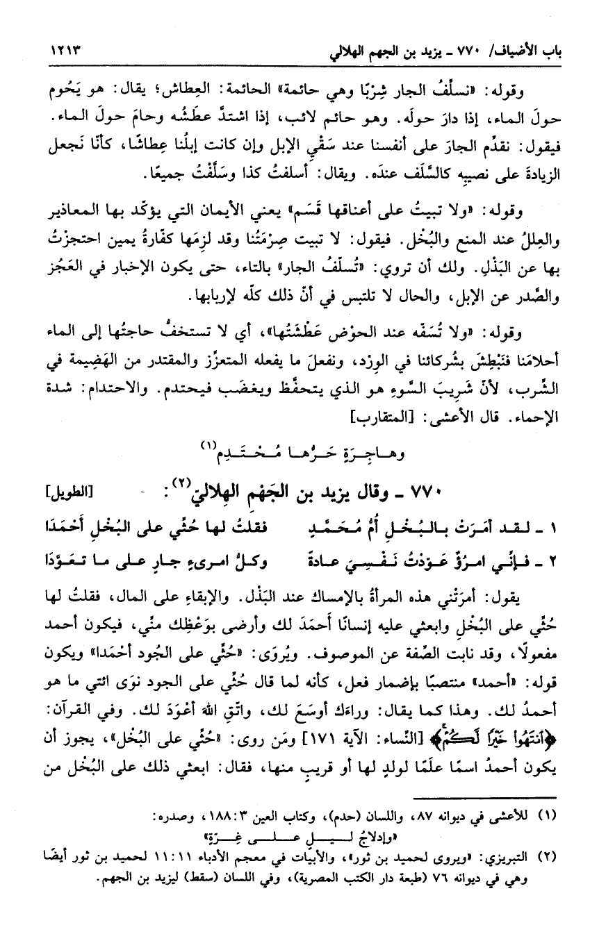 وقوله نسلف الجار شرباً وهي حائمة الحائمة: العطاش؛ يقال: هو يحوم حول الماء. إذا دار حوله. وهو حائم لائب، إذا اشتد عطشه وحام حول الماء. فيقول: نقدم الجار على انفسنا عند سقي الإبل وإن كانت إبلنا عطاشاً، كأنا نجعل الزيادة على نصيبه كالسلف عنده. ويقال: أسلفت كذا وسلفت جميعاً. وقوله ولا تبيت على أعناقها قسم يعني الأيملن التي يؤك بها المعاذير والعلل عند المنع والبخل. فيقول: لا تبيت صرمتنا وقد لزمها كفارة يمين احتجزت بها عن البذل. ولك أن ترى: تسلف الجار بالتاء، حتى يكون الإخبار في العجز والصدر عن الإبل، والحال لا تلتبس في أن ذلك كله لأربابها.