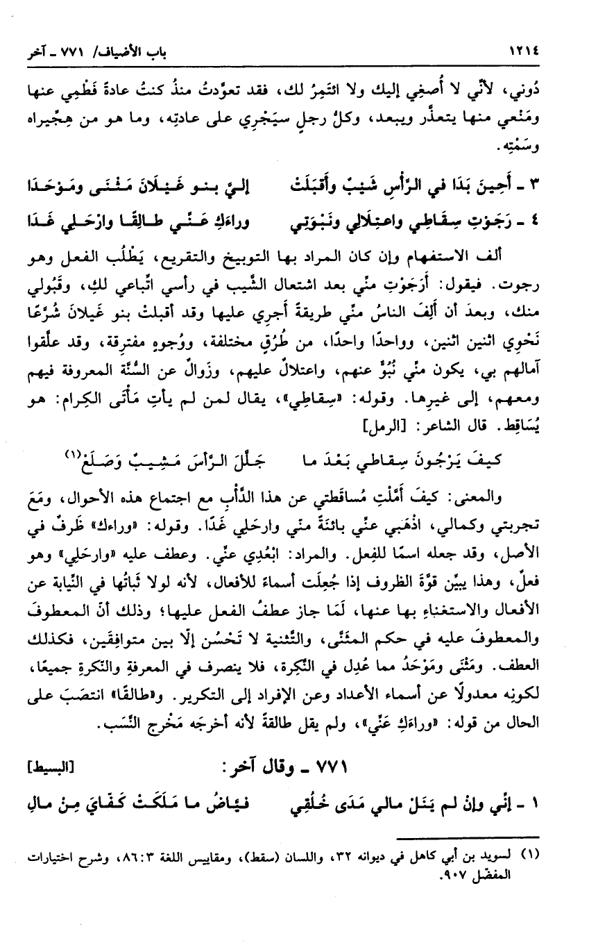 ألفت الاستفهام وإن كان المراد بها التوبيخ والتقريع، يطلب الفعل وهو رجوت. فيقول: أرجوت مني بعد اشتعال الشيب في رأسي اتباعي لك، وقبولي منك، وبعد أن ألف الناس مني طريقة أجرى عليها وقد أقبلت بنو غيلان شرعاً نحوي اثنين اثنين، وواحداً واحداً، من طرق مختلفة، ووجوه مفترقة، وقد علقوا آمالهم بي، يكون مني نبؤ عنهم، واعتلال عليهم، وزوال عن السنة المعروفة فيهم ومعهم، إلى غيرها. وقوله سقاطي، يقال لمن لم يأت مأتى الكرام: هو يساقط. قال الشاعر: