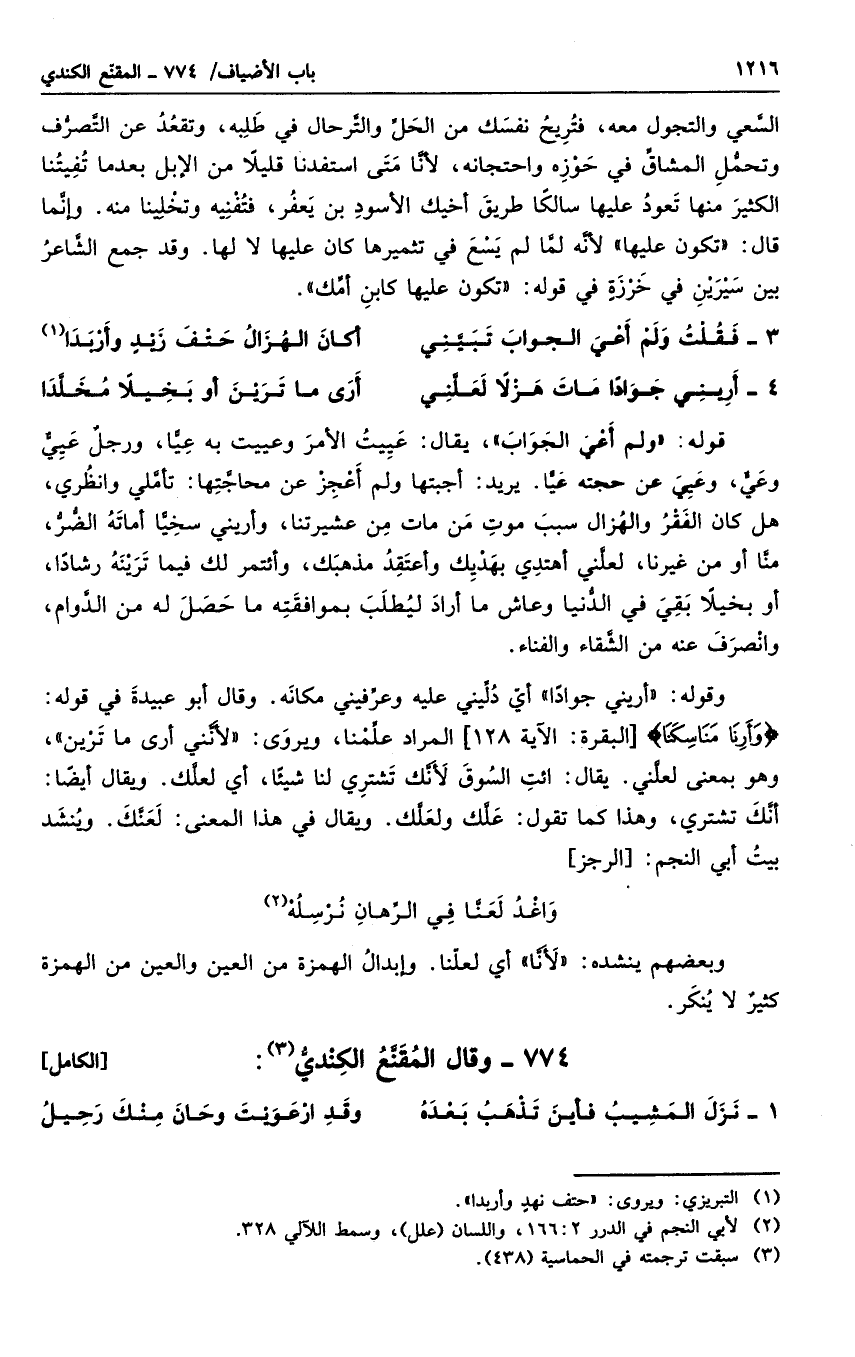 قوله ولم أعي الجواب، يقال: عييت الأمر وعييت به عياً، ورجل عيي وعي، وعيي عن حجته عيا. يريد: أجبتها ولم أعجز عن محاجتها: تأملي وانظري، هل كان الفقر والهزال سبب موت من مات من عشيرتنا، وأريني سخياً أماه الضر، منا أو من غيرنا، لعلني أهتدي بهديك وأعتقد مذهبك، وأئتمر لك فيما ترينه رشاداً، أو بخيلاً بقي في الدنيا وعاش ما أراد ليطلب بموافقته ما حصل له من الدوام، وانصرف عنه من الشقاء والفناء.