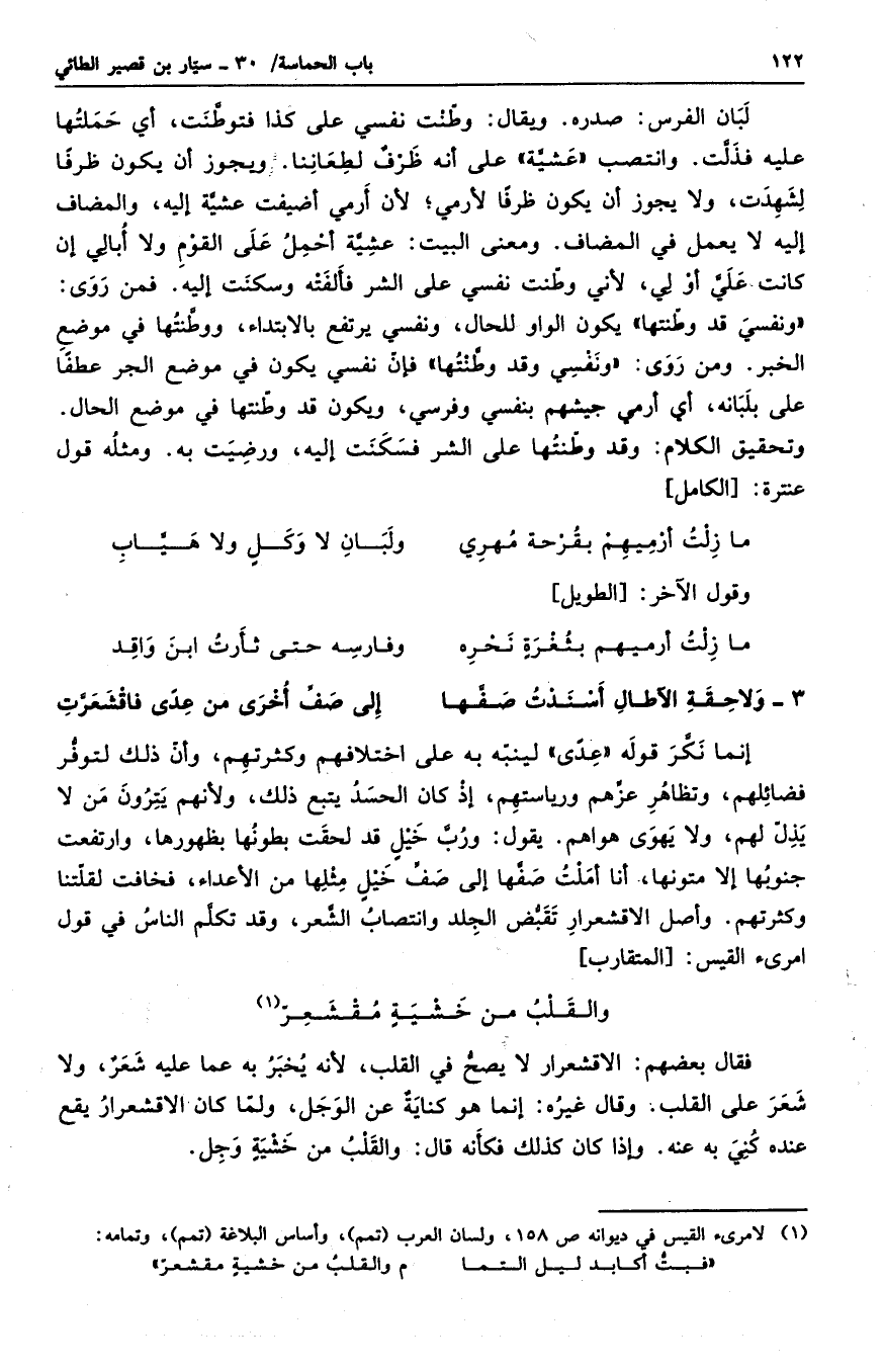 إنما نكر قوله عدىً لينبه به على اختلافهم وكثرتهم، وأن ذلك لتوفر فضائلهم، وتظاهر عزهم ورياستهم، إذ كان الحسد يتبع ذلك، ولأنهم يترون من لا يذل لهم، ولا يهوى هواهم. يقول: ورب خيلٍ قد لحقت بطونها بظهورها، وارتفعت جنوبها إلا متونها، أنا أملت صفها إلى صف خيلٍ مثلها من الأعداء، فخافت لقلتنا وكثرتهم. وأصل الاقشعرار تقبض الجلد وانتصاب الشعر، وقد تكلم الناس في قول امرئ القيس: