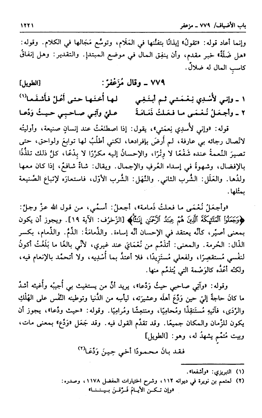 قوله وإني لأسدي نعمتي، يقول: إذا اصطنعت عند إنسان صنيعه، وأوليته لاتصال رجائه بي عارفة، لم أرض بإفرادها، لكني أطلب لها توابع ولواحق، حتى تصير النعمة عنده شفعاً لا وتراً، والإحسان إليه مكرراً لابدعاً، كل ذلك تلذذاً بالإفضال، وشهوة في إسداء العرف والإجمال. ويقال: شاة شافع، إذا كان معها ولدها. والعلل: الشرب الثاني. والنهل: الشرب الأول، فاستعاره لإتباع الصنيعة بمثلها.