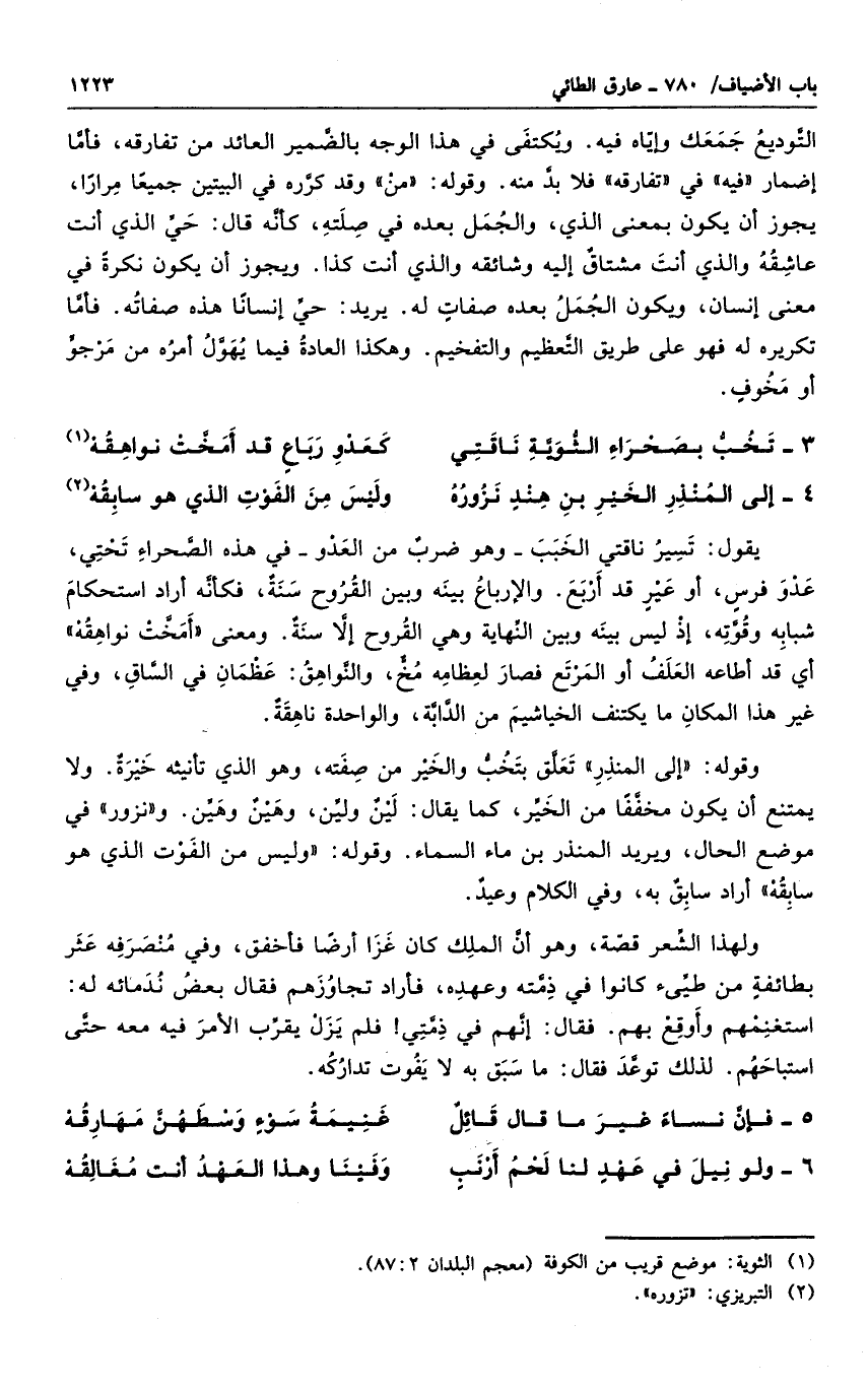 التوديع جمعك وإياه فيه. ويكتفي في هذا الوجه بالضمير العائد من تفارقه، فأما إضمار فيه في تفارقه فلا بد منه. وقوله من وقد كرره في البيتين جميعاً مراراً، يجوز أن يكون بمعنى الذي، والجمل بعده في صلته، كأنه قال: حي الذي أنت عاشقه والذي أنت مشتاق إليه وشائقه والذي أنت كذا. ويجوز أن يكون نكرة في معنى إنسان، ويكون الجمل بعده صفات له. يريد: حي إنساناً هذه صفاته. فأما تكريره له فهو على طريق التعظيم والتفخيم. وهكذا العادة فيما يهول أمره من مرجو أو مخوف.