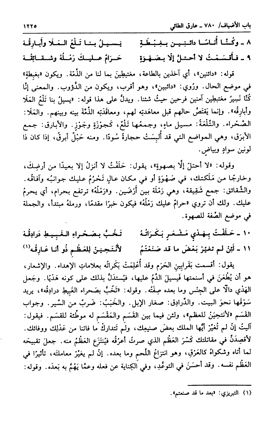 قوله دائنين، أي آخذين بالطاعة، مغتبطين بما لنا من الذمة. ويكون بغطبة في موضع الحال. وروى: دائبين، وهو أقرب، ويكون من الدؤوب. والمعنى إنا كنا نسير مغتبطين آمنين فرحين حيث شئنا. ويدل على هذا قوله يسيل بنا تلع الملا وأبارقه. وإنما يقتص حالهم قبل معاهدته لهم، ومعاقدته الذمة بينه وبينهم. والملا: الصحراء. والتلعة: مسيل ماء، وجمعها تلع، كجوزة وجوز. والأبارق: جمع الأبرق، وهي المواضع التي قد ألبست حجارة سوداً. ومنه حبل أبرق، إذا كان ذا لونين سوداً وبياض. وقوله لا أحتل إلا بصهوة، يقول: حلفت لا انزل إلا بعيداً من أرضك، وخارجاً من ملكتك، في صهوة أو في مكان عال تحرم عليك جوانبه وآفاقه. والشقائق: جمع شقيقة، وهي رملة بين أرضين. ورمله ترتفع بحرام، أي يحرم عليك. ولك أن تروى حرام عليك رمله فيكون خبراً مقدماً، ورمله مبتدأ، والجملة في موضع الصفة للصهوة.