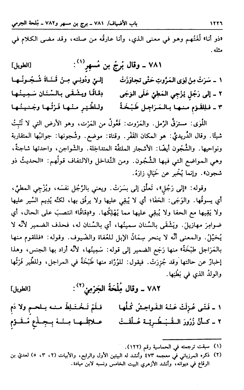 وقوله إلى رجل، تعلق إلي بسرت. ويعني بالرجل نفسه، ويزجى المطي، أي يسوقها. والوجى: الحفا؛ أي لا يبقى عليها ولا يرفق بها، لكنه يديم السير عليها ولا يقبها مع الحفا ولا يبقى عليها مما يهلكها. ودقاقاً انتصب على الحال، أي ضوامر مهازيل. ويشقى بالسنان سمينها، أي بالسنان له، فحذف الضمير لأنه لا يخيل. والمعنى أنه لا ينحر سمان الإبل للعفاة والضيوف. وقوله فللقوم منها بالمراجل طبخة منها رجع الضمير إلى قوله سمينها، لأنه أراد بها الجنس، وهذا إخبار عن حالتها وقد جزرت. فيقول: للوارد منها طبخة في المراجل، وللطير فرثها والولد الذي في بطنها.