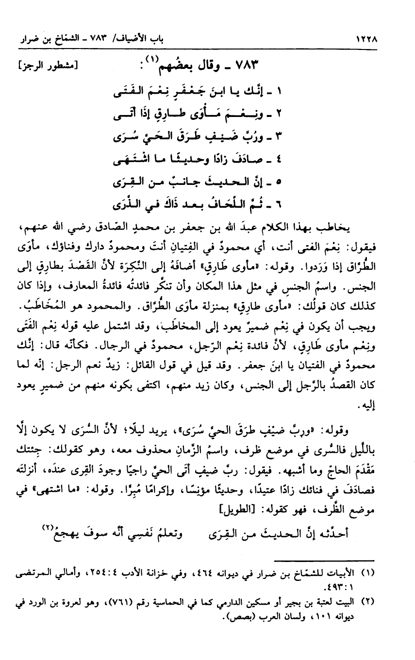 يخاطب بهذا الكلام عبد الله بم جعفر بن محمد الصادق رضي الله عنهم، فيقول: نعم الفتى أنت، أي محمود في الفتيان أنت ومحمود دارك وفناؤك، مأوى الطراق إذا وردوا. وقوله مأوى طارق أضافه إلى النكرة لأن القصد بطارق إلى الجنس، واسم الجنس في مثل هذا المكان وأن تنكر فائدته فائدة المعارف، وإذا كان كذلك كان قولك مأوى طارق بمنزلة مأوى الطراق. والمحمود هو المخاطب. ويجب أن يكون في نعم ضمير يعود إلى المخاطب، وقد اشمل عليه قوله نعم الفتى ونعم مأوى طارق، لأن فائدة نعم الرجل، محمود في الرجال. فكأنه قال: إنك محمود في الفتيان يا ابن جعفر. وقد قيل في قول القائل: زيد نعم الرجل: إنه لما كان القصد بالرجل إلى الجنس، وكان زيد منهم، اكتفى بكونه منهم من ضمير يعود إليه.