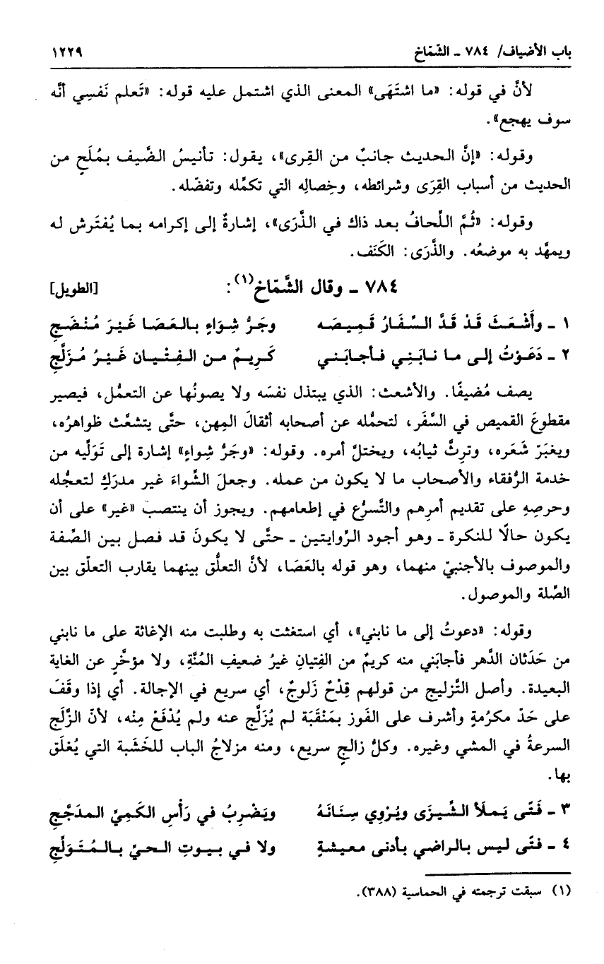 لأن في قوله ما اشتهى المعنى الذي عليه قوله تعلم نفسي أنه سوف يهجع. وقوله إن الحديث جانب من القرى، يقول: تأنيس الضيف بملح من الحديث من أسباب القرى وشرائطه، وخصاله التي تكمله وتفضله. وقوله ثم اللحاف بعد ذاك في الذرى، إشارة إلى إكرامه بما يفترش له ويمهد به موضعه. والذرى: الكنف.
